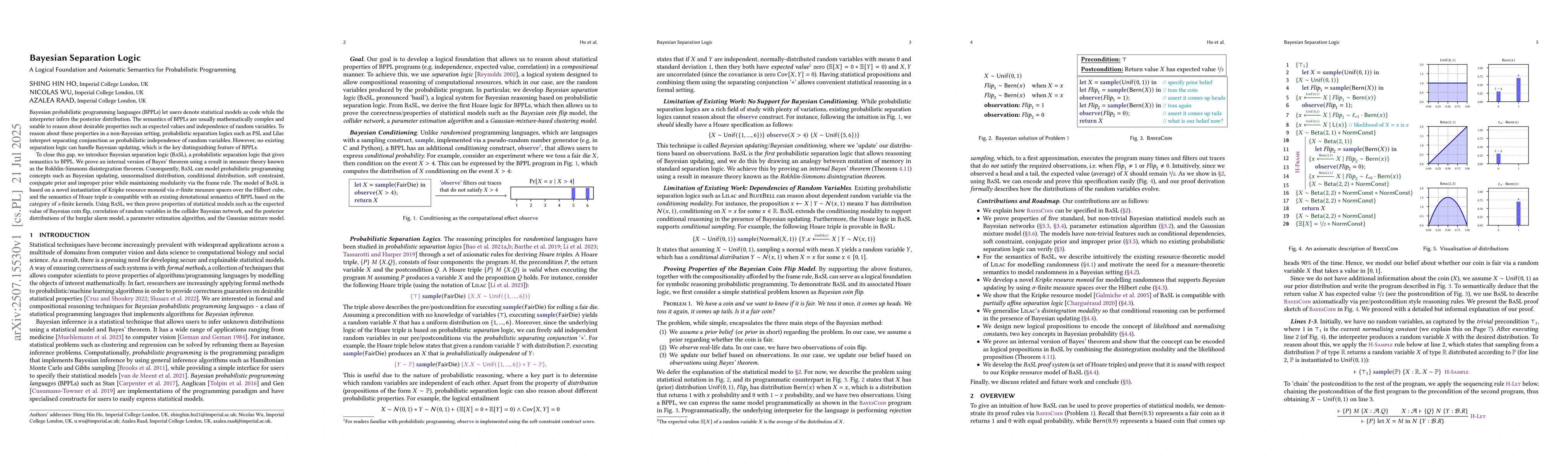 Bayesian probabilistic programming languages (BPPLs) let users denote statistical models as code while the interpreter infers the posterior distribution. The semantics of BPPLs are usually mathematically complex and unable to reason about desirable properties such as expected values and independence of random variables. To reason about these properties in a non-Bayesian setting, probabilistic separation logics such as PSL and Lilac interpret separating conjunction as probabilistic independence of random variables. However, no existing separation logic can handle Bayesian updating, which is the key distinguishing feature of BPPLs. To close this gap, we introduce Bayesian separation logic (BaSL), a probabilistic separation logic that gives semantics to BPPL. We prove an internal version of Bayes' theorem using a result in measure theory known as the Rokhlin-Simmons disintegration theorem. Consequently, BaSL can model probabilistic programming concepts such as Bayesian updating, unnormalised distribution, conditional distribution, soft constraint, conjugate prior and improper prior while maintaining modularity via the frame rule. The model of BaSL is based on a novel instantiation of Kripke resource monoid via $\sigma$-finite measure spaces over the Hilbert cube, and the semantics of Hoare triple is compatible with an existing denotational semantics of BPPL based on the category of $s$-finite kernels. Using BaSL, we then prove properties of statistical models such as the expected value of Bayesian coin flip, correlation of random variables in the collider Bayesian network, and the posterior distributions of the burglar alarm model, a parameter estimation algorithm, and the Gaussian mixture model.