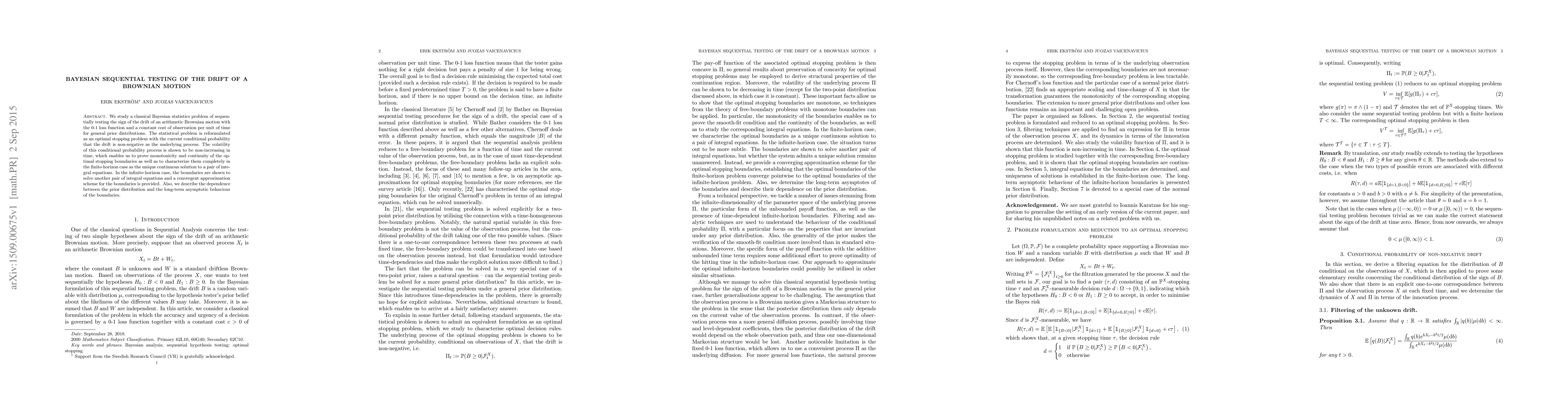 This paper explores Bayesian sequential testing for the drift of a Brownian motion, reformulating it as an optimal stopping problem. It characterizes the optimal stopping boundaries through integral equations and discusses their behavior under different horizons, highlighting the impact of prior distributions on long-term asymptotic behavior.
