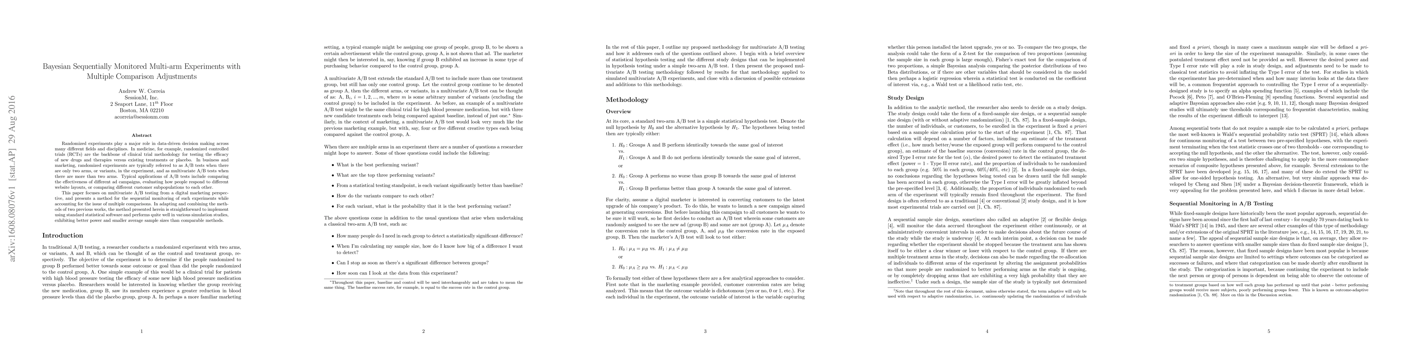 Randomized experiments play a major role in data-driven decision making across many different fields and disciplines. In medicine, for example, randomized controlled trials (RCTs) are the backbone of clinical trial methodology for testing the efficacy of new drugs and therapies versus existing treatments or placebo. In business and marketing, randomized experiments are typically referred to as A/B tests when there are only two arms, or variants, in the experiment, and as multivariate A/B tests when there are more than two arms. Typical applications of A/B tests include comparing the effectiveness of different ad campaigns, evaluating how people respond to different website layouts, or comparing different customer subpopulations to each other. This paper focuses on multivariate A/B testing from a digital marketing perspective, and presents a method for the sequential monitoring of such experiments while accounting for the issue of multiple comparisons. In adapting and combining the methods of two previous works, the method presented herein is straightforward to implement using standard statistical software and performs quite well in various simulation studies, exhibiting better power and smaller average sample sizes than comparable methods.