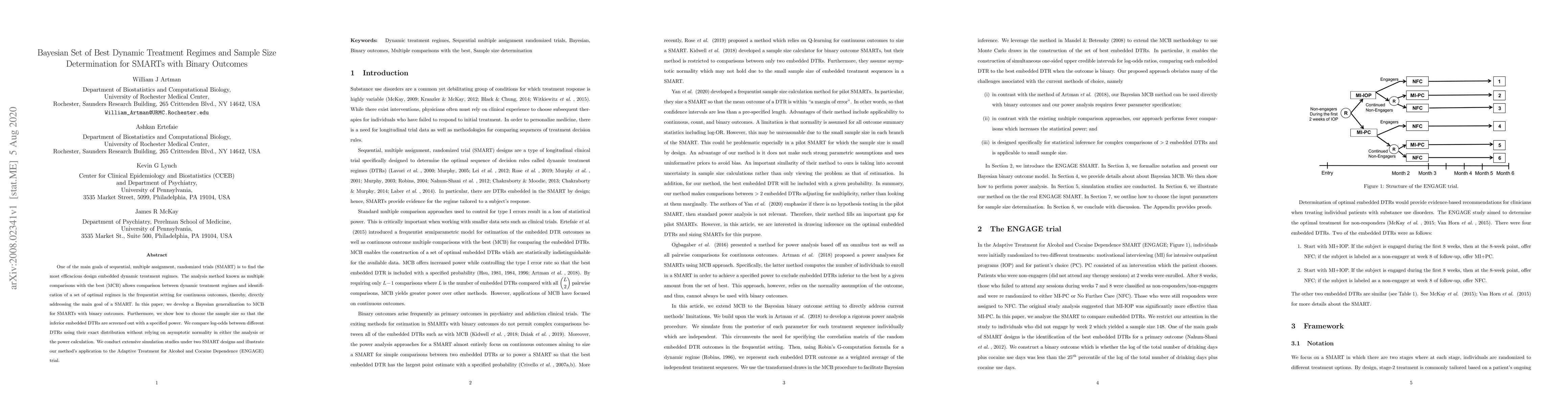 One of the main goals of sequential, multiple assignment, randomized trials (SMART) is to find the most efficacious design embedded dynamic treatment regimes. The analysis method known as multiple comparisons with the best (MCB) allows comparison between dynamic treatment regimes and identification of a set of optimal regimes in the frequentist setting for continuous outcomes, thereby, directly addressing the main goal of a SMART. In this paper, we develop a Bayesian generalization to MCB for SMARTs with binary outcomes. Furthermore, we show how to choose the sample size so that the inferior embedded DTRs are screened out with a specified power. We compare log-odds between different DTRs using their exact distribution without relying on asymptotic normality in either the analysis or the power calculation. We conduct extensive simulation studies under two SMART designs and illustrate our method's application to the Adaptive Treatment for Alcohol and Cocaine Dependence (ENGAGE) trial.