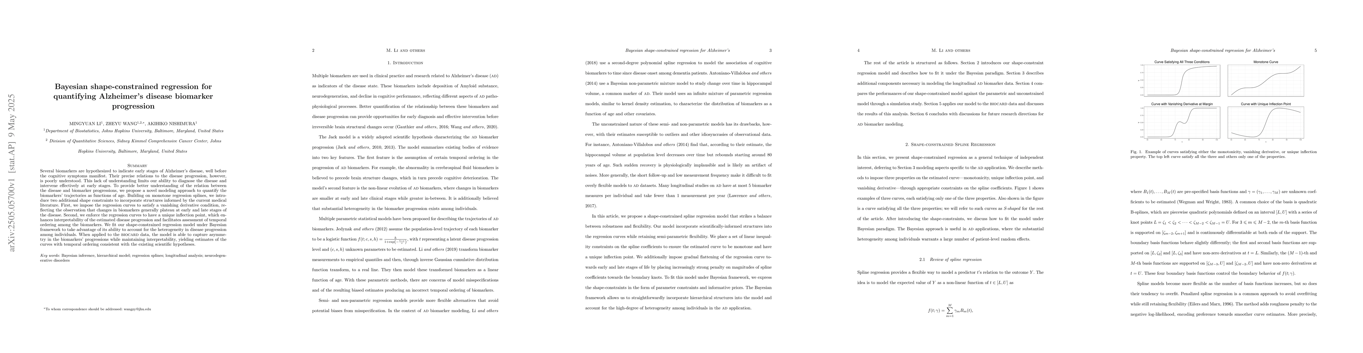 The research proposes a novel Bayesian shape-constrained regression model using monotone regression splines, incorporating vanishing derivative and unique inflection point constraints informed by medical literature to quantify Alzheimer's biomarker progressions as functions of age.