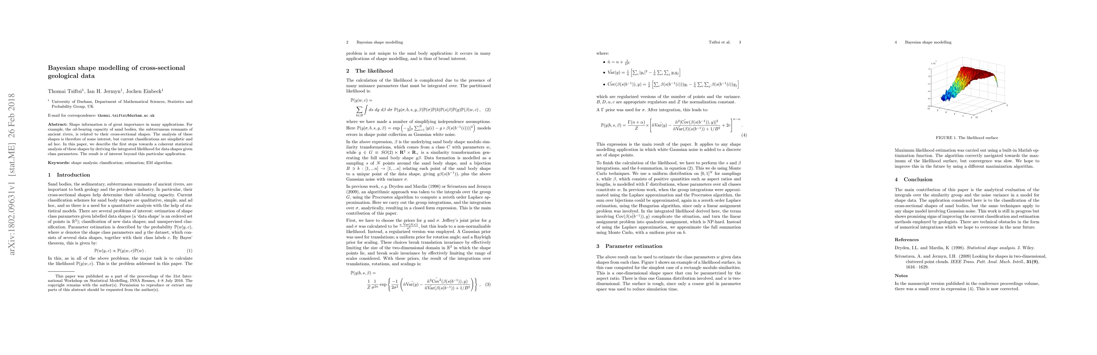 Shape information is of great importance in many applications. For example, the oil-bearing capacity of sand bodies, the subterranean remnants of ancient rivers, is related to their cross-sectional shapes. The analysis of these shapes is therefore of some interest, but current classifications are simplistic and ad hoc. In this paper, we describe the first steps towards a coherent statistical analysis of these shapes by deriving the integrated likelihood for data shapes given class parameters. The result is of interest beyond this particular application.