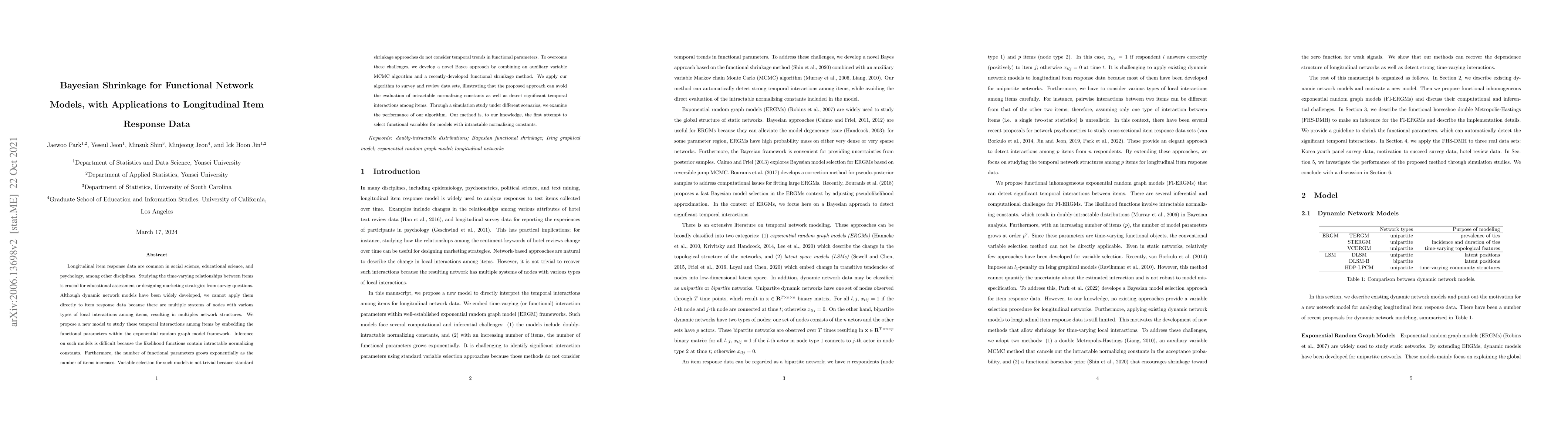 This paper proposes a Bayesian shrinkage method for functional network models to analyze longitudinal item response data, addressing the challenges of multiplex network structures and intractable likelihood functions. The new approach combines an auxiliary variable MCMC algorithm and functional shrinkage to detect significant temporal interactions without evaluating complex normalizing constants.