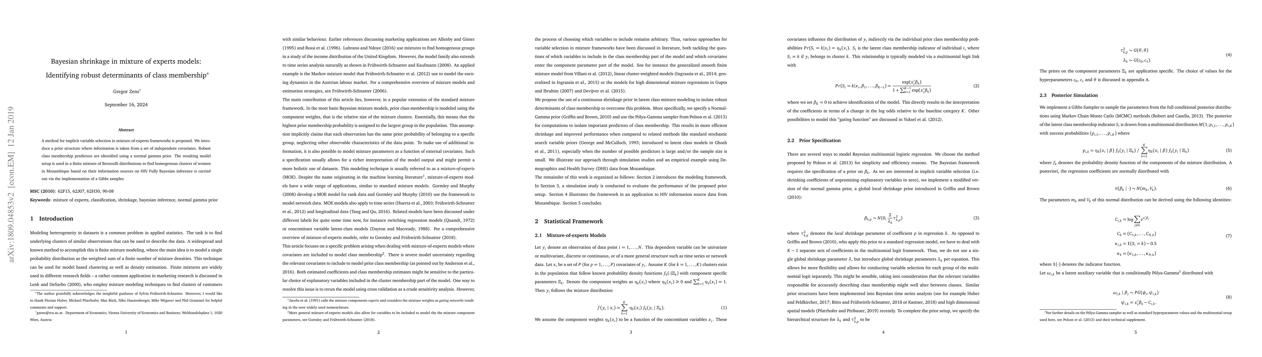 Researchers propose a Bayesian method to identify robust determinants of class membership in mixture of experts models using independent covariates and normal gamma priors. The approach is applied to analyze information sources on HIV among women in Mozambique, revealing homogenous clusters of women based on their information sources.