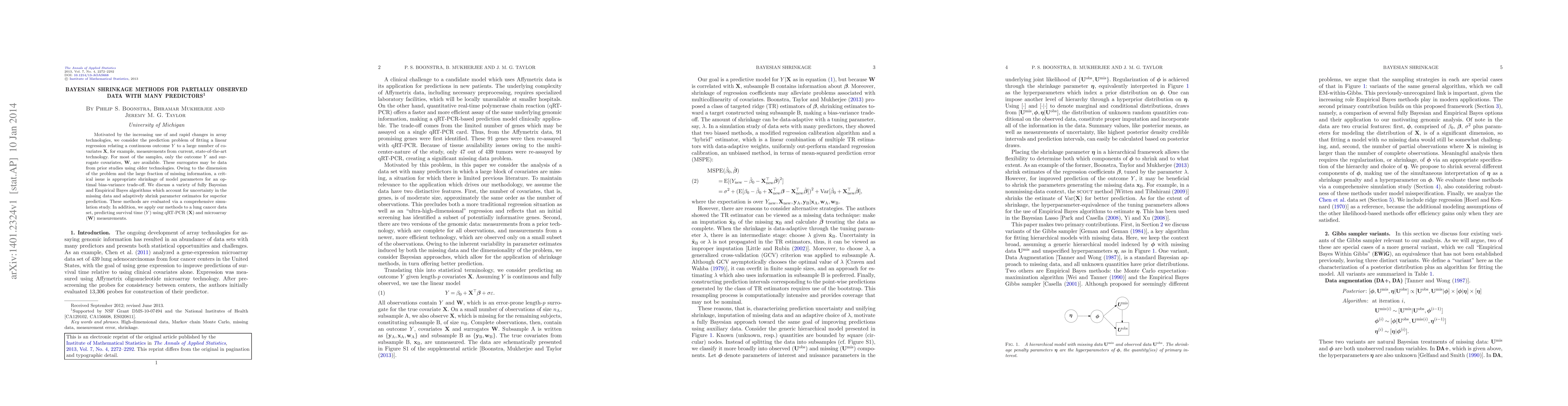 Motivated by the increasing use of and rapid changes in array technologies, we consider the prediction problem of fitting a linear regression relating a continuous outcome $Y$ to a large number of covariates $\mathbf {X}$, for example, measurements from current, state-of-the-art technology. For most of the samples, only the outcome $Y$ and surrogate covariates, $\mathbf {W}$, are available. These surrogates may be data from prior studies using older technologies. Owing to the dimension of the problem and the large fraction of missing information, a critical issue is appropriate shrinkage of model parameters for an optimal bias-variance trade-off. We discuss a variety of fully Bayesian and Empirical Bayes algorithms which account for uncertainty in the missing data and adaptively shrink parameter estimates for superior prediction. These methods are evaluated via a comprehensive simulation study. In addition, we apply our methods to a lung cancer data set, predicting survival time ($Y$) using qRT-PCR ($\mathbf {X}$) and microarray ($\mathbf {W}$) measurements.