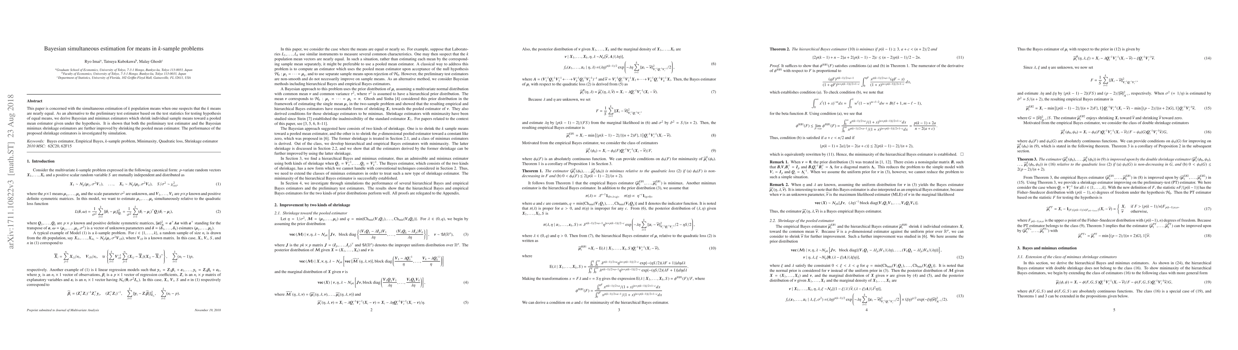 This paper proposes Bayesian and minimax shrinkage estimators for simultaneously estimating $k$ population means when they are suspected to be nearly equal, improving upon preliminary test estimators by shrinking pooled mean estimates. Simulation results assess the performance of these shrinkage estimators.
