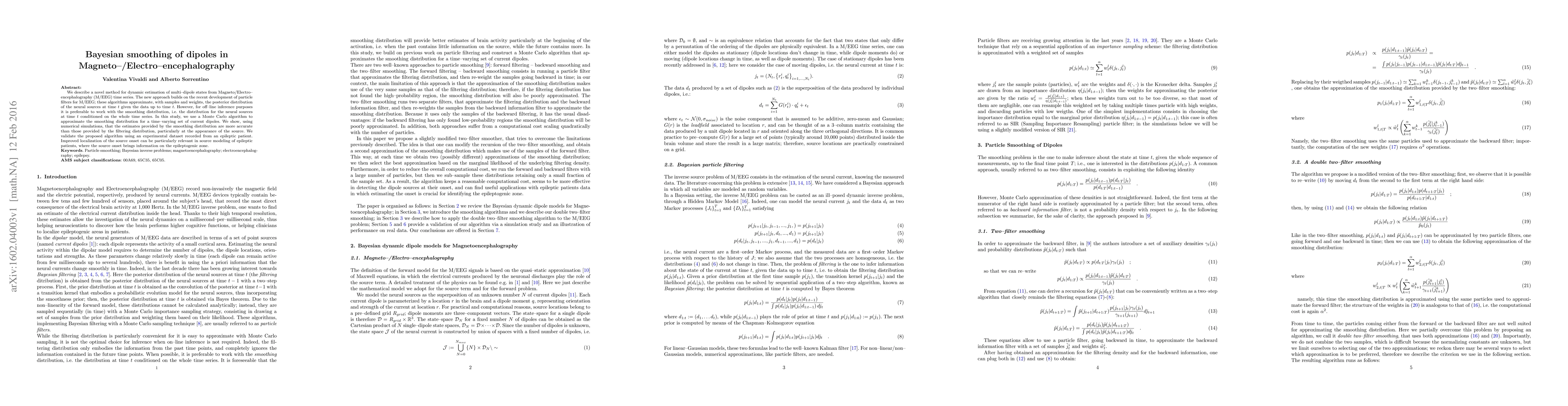We describe a novel method for dynamic estimation of multi-dipole states from Magneto/Electro-encephalography (M/EEG) time series. The new approach builds on the recent development of particle filters for M/EEG; these algorithms approximate, with samples and weights, the posterior distribution of the neural sources at time t given the data up to time t. However, for off-line inference purposes it is preferable to work with the smoothing distribution, i.e. the distribution for the neural sources at time t conditioned on the whole time series. In this study, we use a Monte Carlo algorithm to approximate the smoothing distribution for a time-varying set of current dipoles. We show, using numerical simulations, that the estimates provided by the smoothing distribution are more accurate than those provided by the filtering distribution, particularly at the appearance of the source. We validate the proposed algorithm using an experimental dataset recorded from an epileptic patient. Improved localization of the source onset can be particularly relevant in source modeling of epileptic patients, where the source onset brings information on the epileptogenic zone.