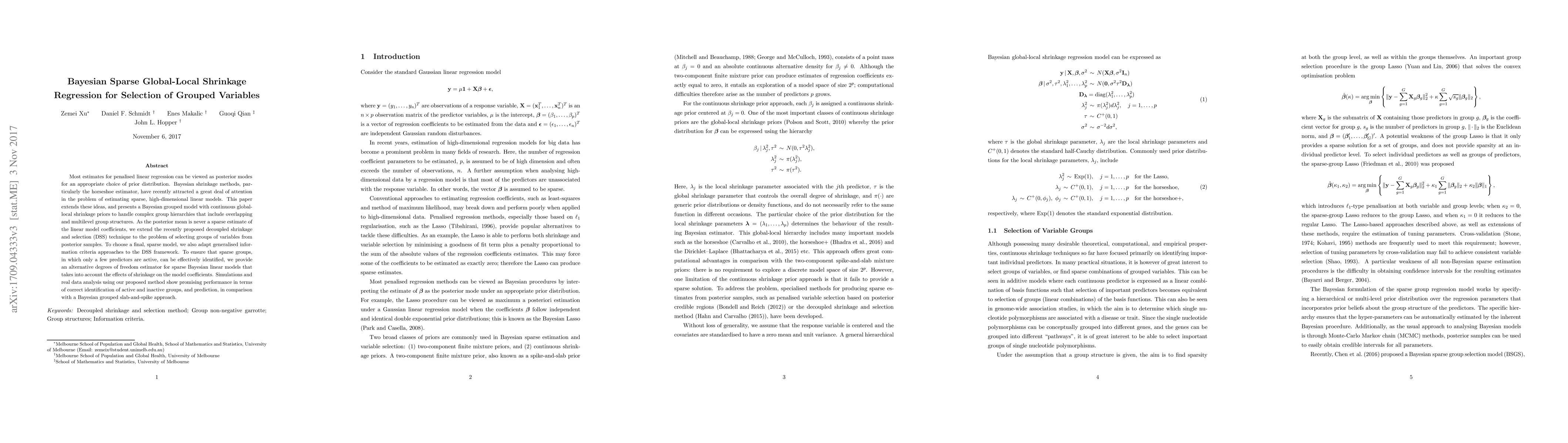 This paper proposes a Bayesian sparse global-local shrinkage regression method for selecting grouped variables in high-dimensional linear models, extending the horseshoe estimator to handle complex group hierarchies. It introduces a decoupled shrinkage and selection technique and adapts generalised information criteria for sparse model selection.