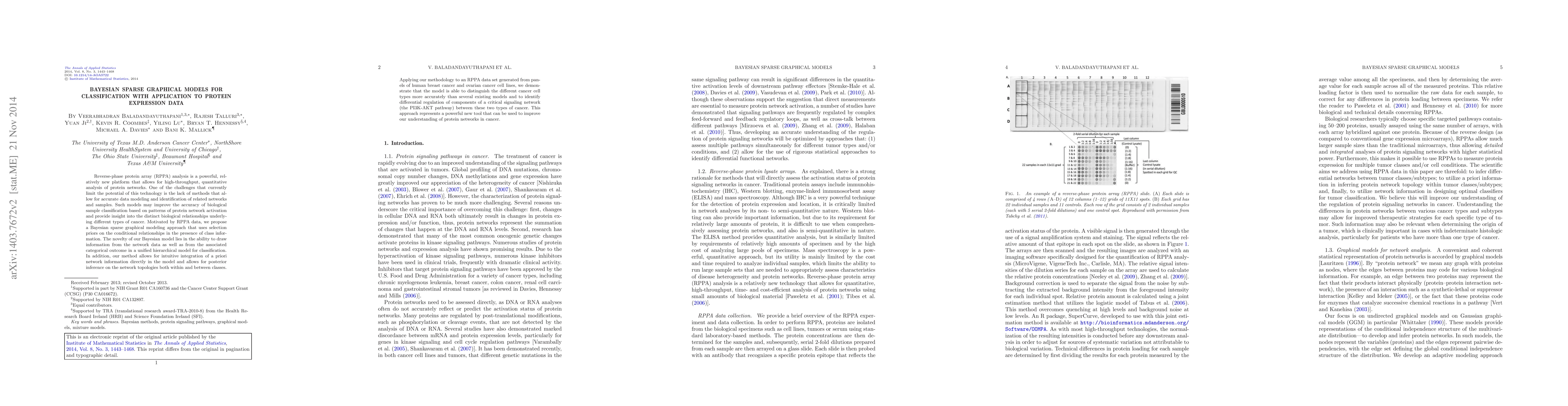 Reverse-phase protein array (RPPA) analysis is a powerful, relatively new platform that allows for high-throughput, quantitative analysis of protein networks. One of the challenges that currently limit the potential of this technology is the lack of methods that allow for accurate data modeling and identification of related networks and samples. Such models may improve the accuracy of biological sample classification based on patterns of protein network activation and provide insight into the distinct biological relationships underlying different types of cancer. Motivated by RPPA data, we propose a Bayesian sparse graphical modeling approach that uses selection priors on the conditional relationships in the presence of class information. The novelty of our Bayesian model lies in the ability to draw information from the network data as well as from the associated categorical outcome in a unified hierarchical model for classification. In addition, our method allows for intuitive integration of a priori network information directly in the model and allows for posterior inference on the network topologies both within and between classes. Applying our methodology to an RPPA data set generated from panels of human breast cancer and ovarian cancer cell lines, we demonstrate that the model is able to distinguish the different cancer cell types more accurately than several existing models and to identify differential regulation of components of a critical signaling network (the PI3K-AKT pathway) between these two types of cancer. This approach represents a powerful new tool that can be used to improve our understanding of protein networks in cancer.