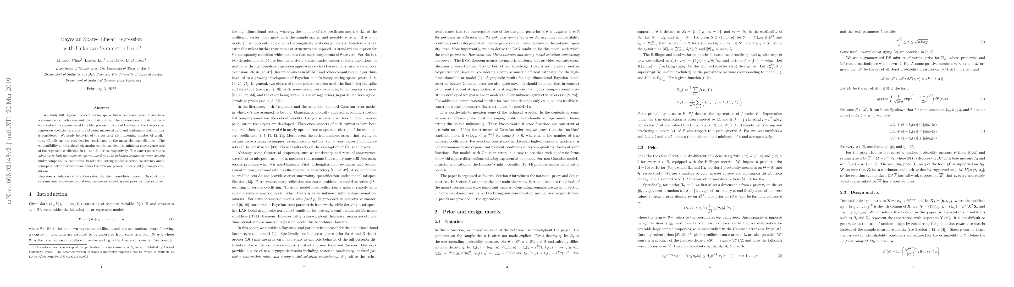 This paper develops Bayesian procedures for sparse linear regression with symmetric but unknown error distributions, employing a symmetrized Dirichlet process mixture of Gaussians. It provides consistency conditions and adaptive convergence rates for regression coefficients, ensuring strong model selection consistency and a semi-parametric Bernstein-von Mises theorem under additional conditions.