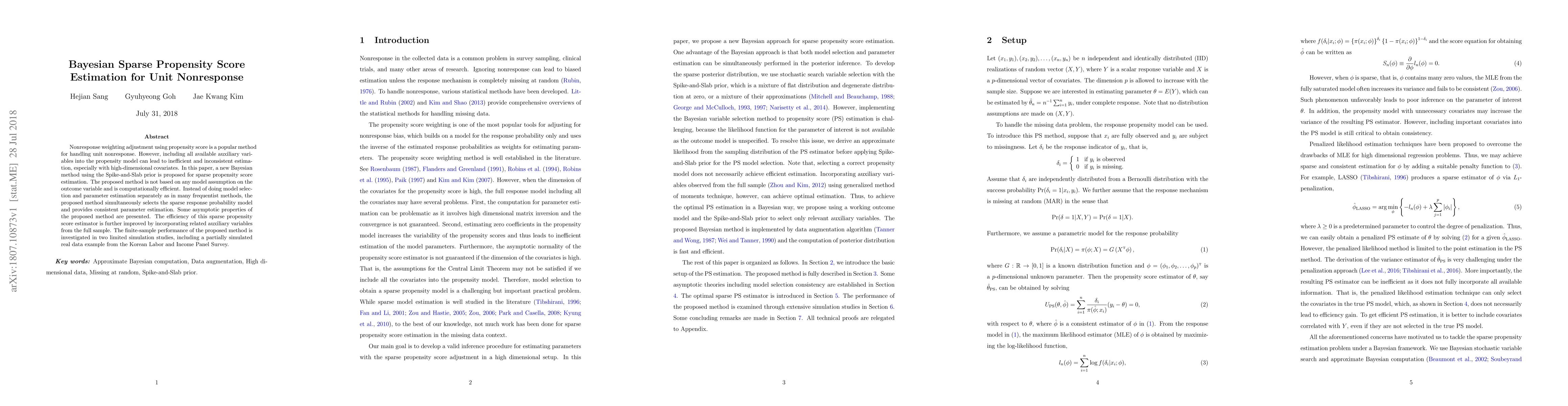 This paper introduces a Bayesian sparse propensity score estimation method using Spike-and-Slab priors to address unit nonresponse, avoiding inefficiencies from high-dimensional covariates. The method simultaneously selects relevant variables and provides consistent estimation without separate model selection and parameter estimation steps.