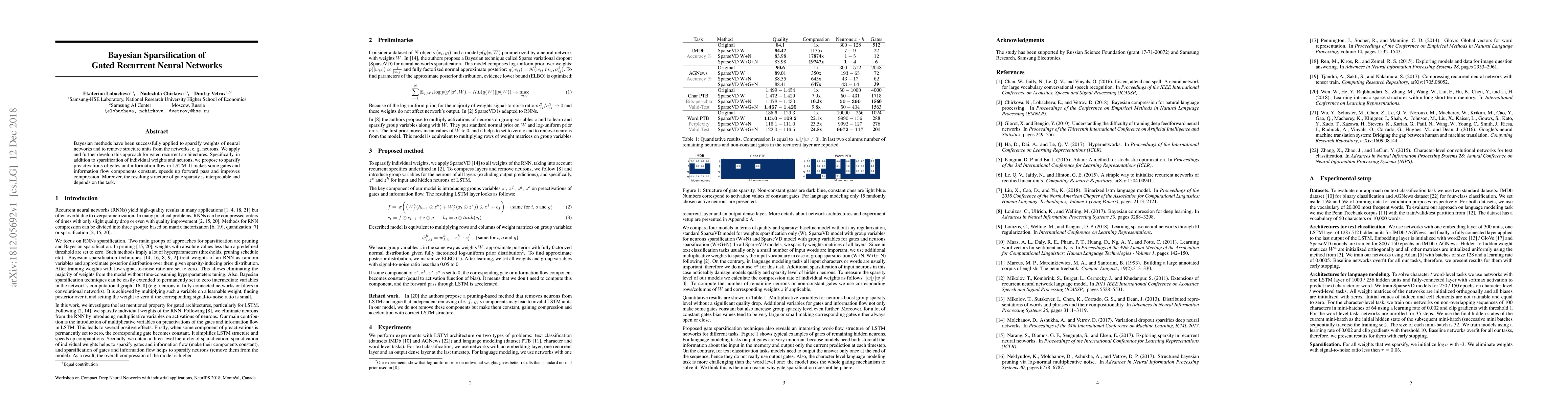 This paper proposes a Bayesian method to sparsify gated recurrent neural networks, including LSTMs, by removing weights, neurons, preactivations, and information flow components, which enhances speed and compression while maintaining interpretable gate sparsity. The approach is task-dependent and code is available on GitHub.