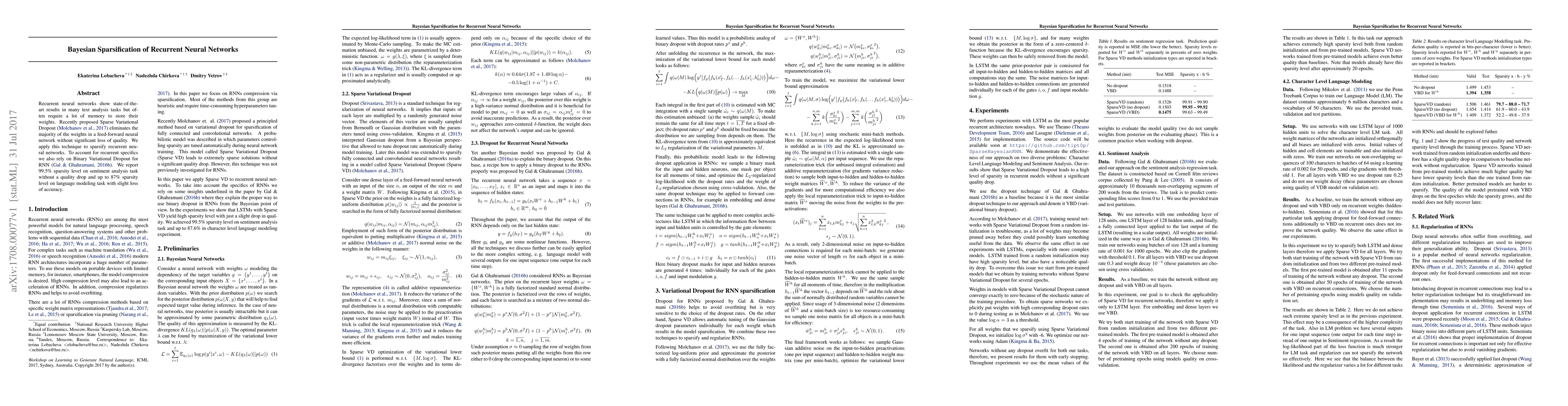 This paper proposes a Bayesian approach to sparsify recurrent neural networks (RNNs) by applying Sparse Variational Dropout and Binary Variational Dropout techniques, achieving 99.5% sparsity in sentiment analysis without loss of quality and up to 87% sparsity in language modeling with minimal accuracy loss.