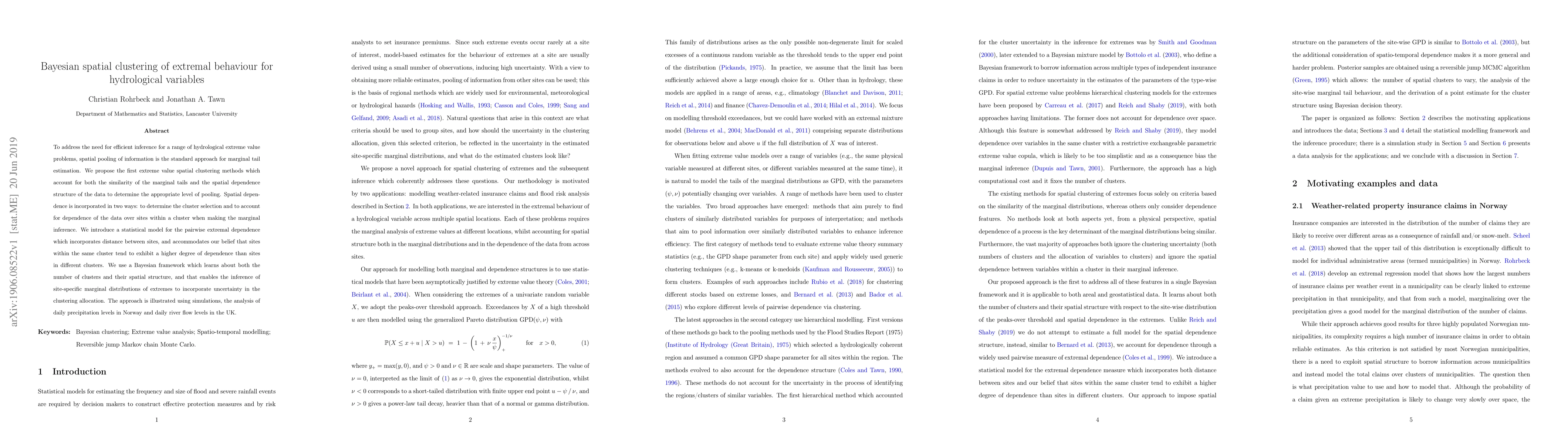 This paper proposes Bayesian spatial clustering methods for hydrological extreme value problems, integrating both marginal tail similarity and spatial dependence to determine optimal pooling levels. The Bayesian framework identifies the number and spatial structure of clusters, enabling inference of site-specific extreme distributions while accounting for clustering uncertainty. The method is demonstrated using precipitation and river flow data.
