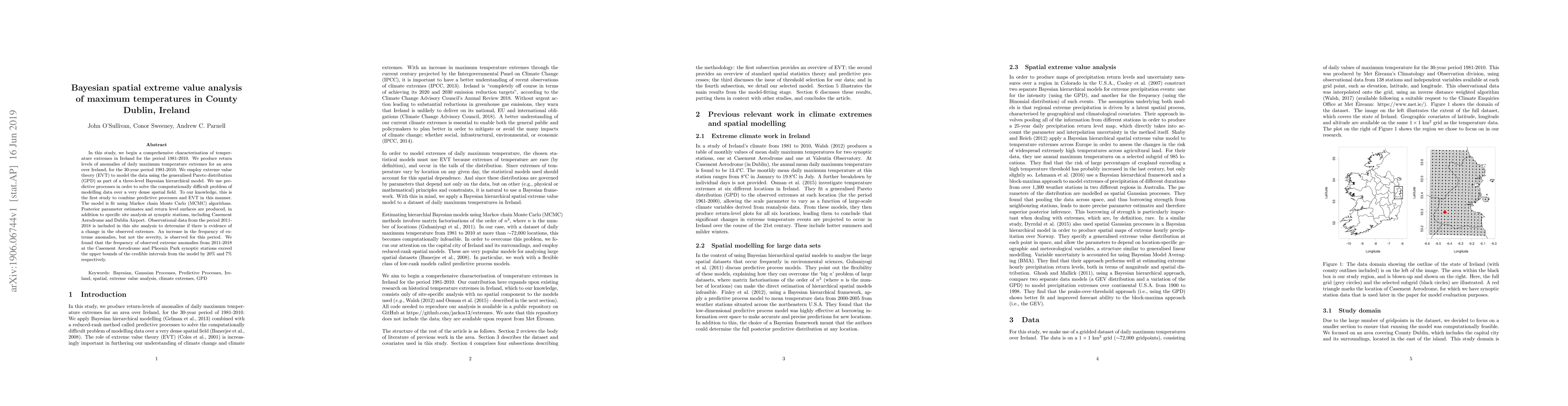 This study employs Bayesian spatial extreme value analysis to model daily maximum temperature extremes in County Dublin, Ireland, from 1981-2010 using a three-level hierarchical model with the generalised Pareto distribution. An increase in the frequency of extreme temperature anomalies is observed from 2011-2018, with notable exceedances at Casement Aerodrome and Phoenix Park.