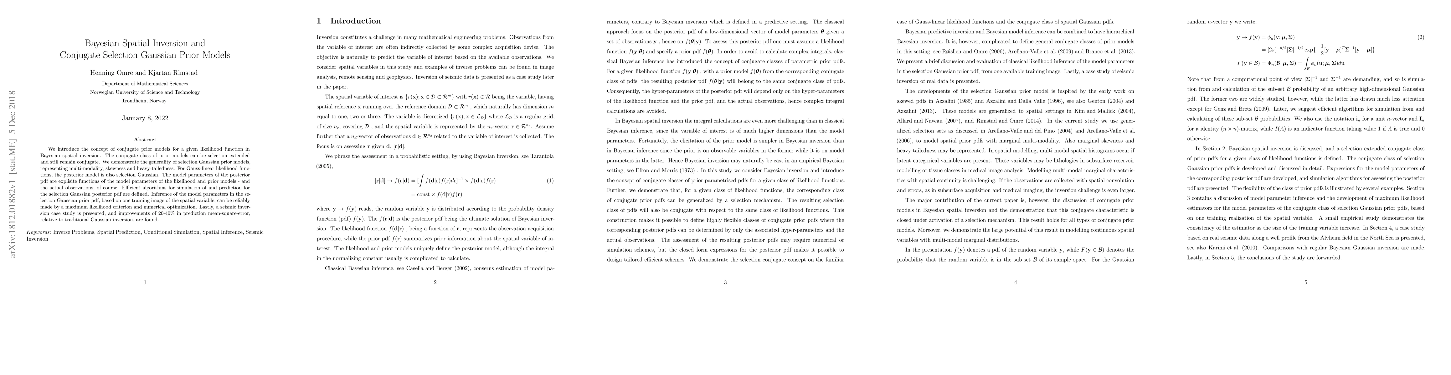 This paper introduces conjugate prior models for Bayesian spatial inversion, demonstrating the versatility of selection Gaussian prior models that can represent complex distributions. It shows efficient algorithms for posterior Gaussian simulations and presents a seismic inversion case study showing significant improvements in prediction accuracy over traditional methods.