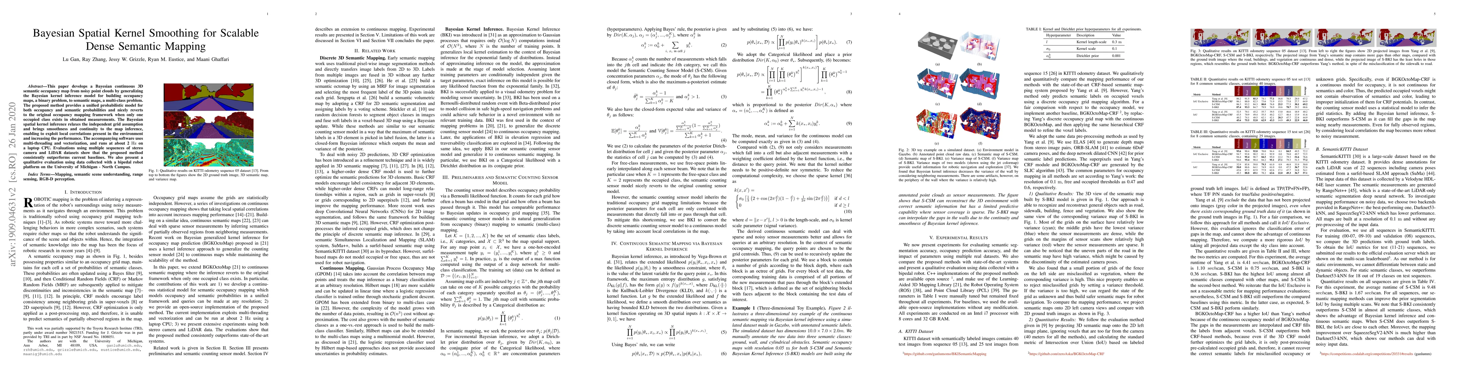 This paper proposes a Bayesian spatial kernel smoothing method for scalable dense semantic mapping, transforming noisy point clouds into a continuous 3D semantic occupancy map. The method outperforms current baselines by leveraging local correlations and providing a unified probabilistic model for occupancy and semantic probabilities.
