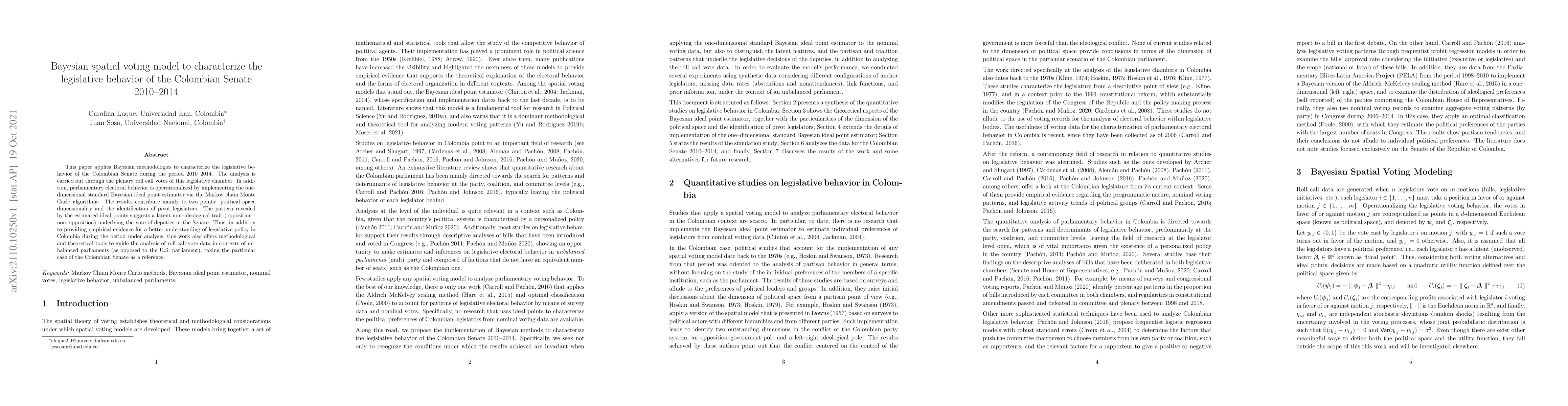 This paper uses Bayesian spatial modeling to analyze the legislative behavior of the Colombian Senate from 2010-2014, revealing a latent non-ideological voting pattern and identifying pivotal legislators. The study provides methodological tools for analyzing roll call votes in unbalanced parliaments.