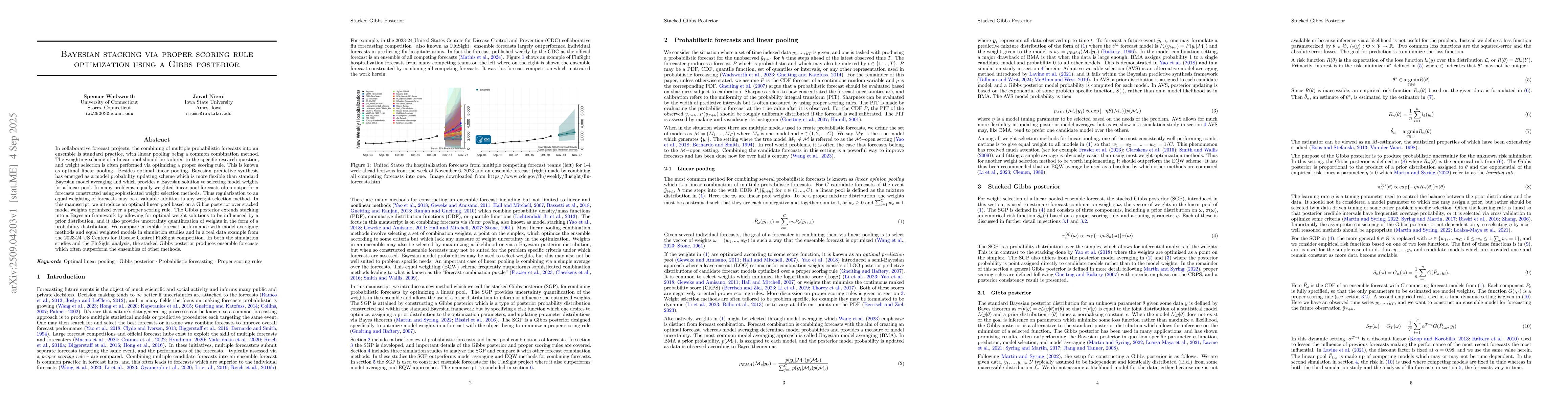 In collaborative forecast projects, the combining of multiple probabilistic forecasts into an ensemble is standard practice, with linear pooling being a common combination method. The weighting scheme of a linear pool should be tailored to the specific research question, and weight selection is often performed via optimizing a proper scoring rule. This is known as optimal linear pooling. Besides optimal linear pooling, Bayesian predictive synthesis has emerged as a model probability updating scheme which is more flexible than standard Bayesian model averaging and which provides a Bayesian solution to selecting model weights for a linear pool. In many problems, equally weighted linear pool forecasts often outperform forecasts constructed using sophisticated weight selection methods. Thus regularization to an equal weighting of forecasts may be a valuable addition to any weight selection method. In this manuscript, we introduce an optimal linear pool based on a Gibbs posterior over stacked model weights optimized over a proper scoring rule. The Gibbs posterior extends stacking into a Bayesian framework by allowing for optimal weight solutions to be influenced by a prior distribution, and it also provides uncertainty quantification of weights in the form of a probability distribution. We compare ensemble forecast performance with model averaging methods and equal weighted models in simulation studies and in a real data example from the 2023-24 US Centers for Disease Control FluSight competition. In both the simulation studies and the FluSight analysis, the stacked Gibbs posterior produces ensemble forecasts which often outperform the ensembles of other methods.