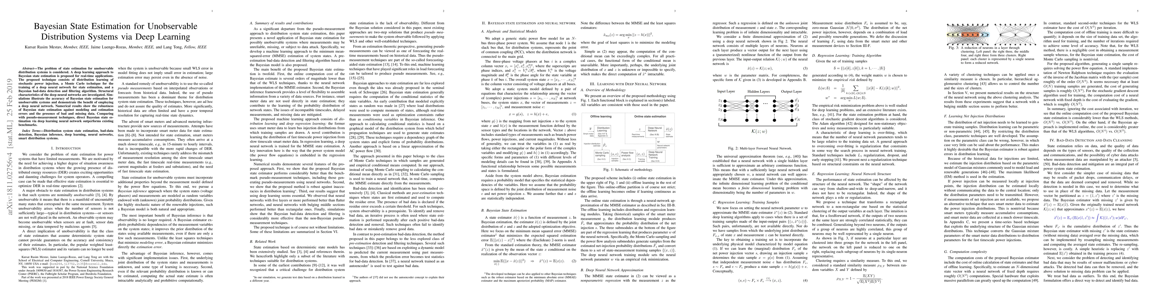 This paper proposes a deep learning approach for Bayesian state estimation in unobservable distribution systems, utilizing a trained deep neural network for real-time applications. The method combines distribution learning, Monte Carlo training, and a Bayesian bad-data detection algorithm, demonstrating superior performance compared to existing benchmarks.