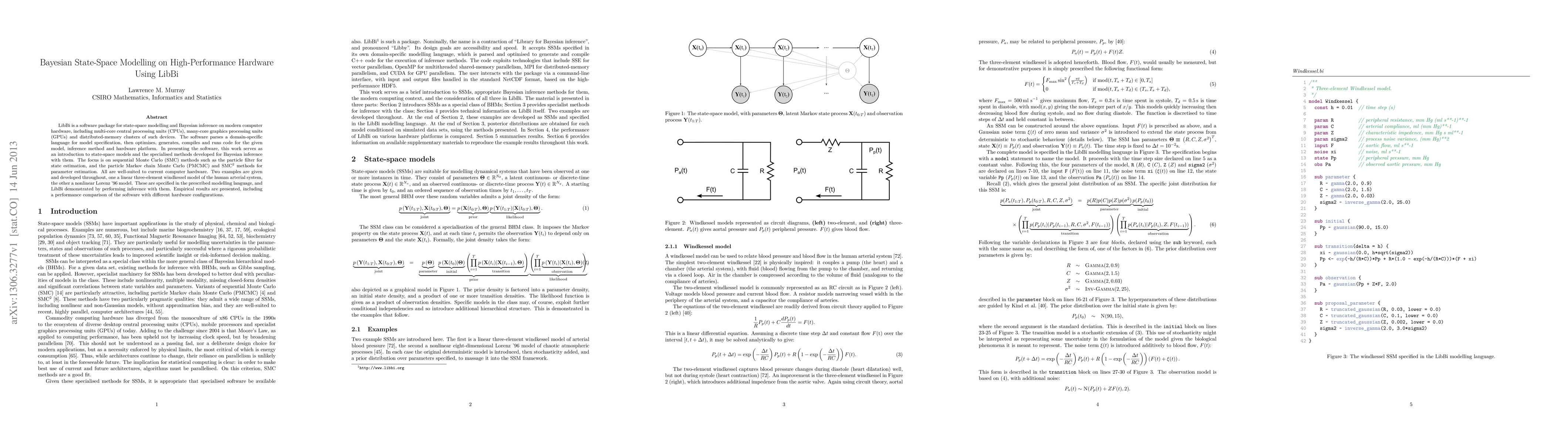 LibBi is a software package for state-space modelling and Bayesian inference on modern computer hardware, including multi-core central processing units (CPUs), many-core graphics processing units (GPUs) and distributed-memory clusters of such devices. The software parses a domain-specific language for model specification, then optimises, generates, compiles and runs code for the given model, inference method and hardware platform. In presenting the software, this work serves as an introduction to state-space models and the specialised methods developed for Bayesian inference with them. The focus is on sequential Monte Carlo (SMC) methods such as the particle filter for state estimation, and the particle Markov chain Monte Carlo (PMCMC) and SMC^2 methods for parameter estimation. All are well-suited to current computer hardware. Two examples are given and developed throughout, one a linear three-element windkessel model of the human arterial system, the other a nonlinear Lorenz '96 model. These are specified in the prescribed modelling language, and LibBi demonstrated by performing inference with them. Empirical results are presented, including a performance comparison of the software with different hardware configurations.