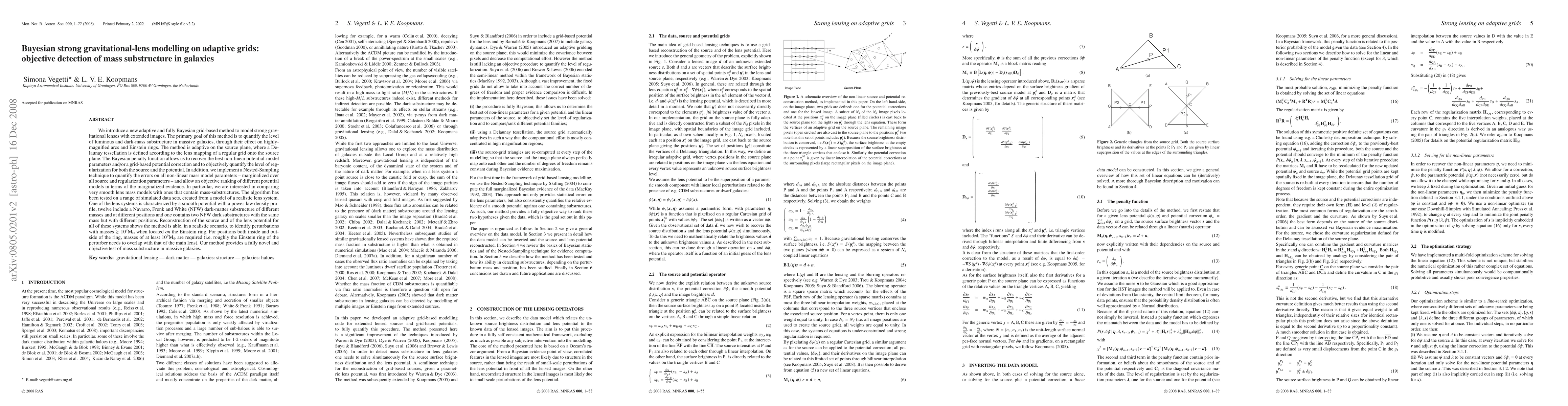 We introduce a new adaptive and fully Bayesian grid-based method to model strong gravitational lenses with extended images. The primary goal of this method is to quantify the level of luminous and dark-mass substructure in massive galaxies, through their effect on highly-magnified arcs and Einstein rings. The method is adaptive on the source plane, where a Delaunay tessellation is defined according to the lens mapping of a regular grid onto the source plane. The Bayesian penalty function allows us to recover the best non-linear potential-model parameters and/or a grid-based potential correction and to objectively quantify the level of regularization for both the source and the potential. In addition, we implement a Nested-Sampling technique to quantify the errors on all non-linear mass model parameters -- ... -- and allow an objective ranking of different potential models in terms of the marginalized evidence. In particular, we are interested in comparing very smooth lens mass models with ones that contain mass-substructures. The algorithm has been tested on a range of simulated data sets, created from a model of a realistic lens system. One of the lens systems is characterized by a smooth potential with a power-law density profile, twelve include a NFW dark-matter substructure of different masses and at different positions and one contains two NFW dark substructures with the same mass but with different positions. Reconstruction of the source and of the lens potential for all of these systems shows the method is able, in a realistic scenario, to identify perturbations with masses >=10^7 solar mass when located on the Einstein ring. For positions both inside and outside of the ring, masses of at least 10^9 solar mass are required (...).