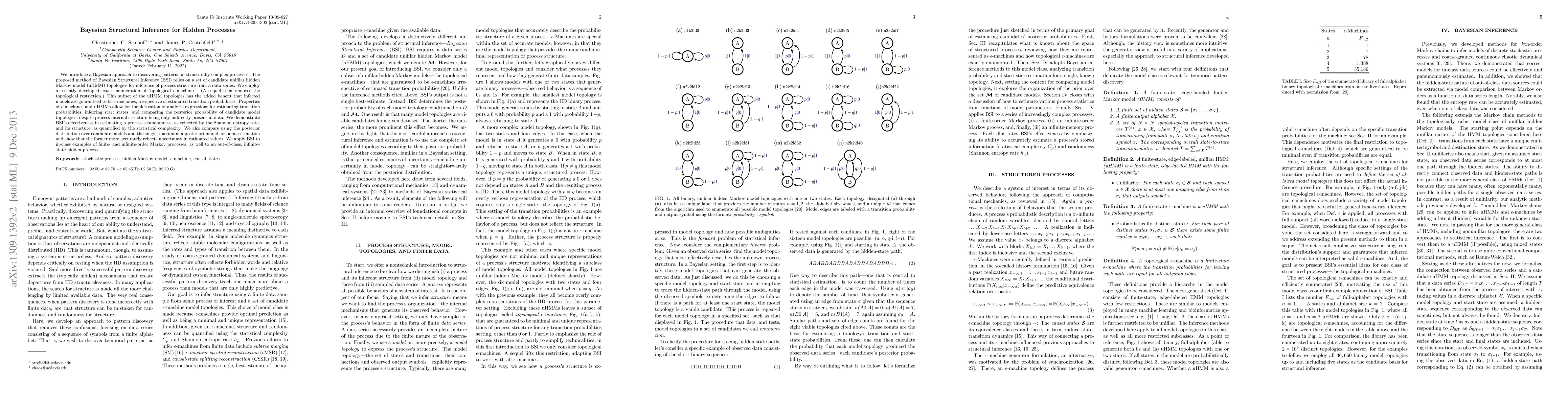 We introduce a Bayesian approach to discovering patterns in structurally complex processes. The proposed method of Bayesian Structural Inference (BSI) relies on a set of candidate unifilar HMM (uHMM) topologies for inference of process structure from a data series. We employ a recently developed exact enumeration of topological epsilon-machines. (A sequel then removes the topological restriction.) This subset of the uHMM topologies has the added benefit that inferred models are guaranteed to be epsilon-machines, irrespective of estimated transition probabilities. Properties of epsilon-machines and uHMMs allow for the derivation of analytic expressions for estimating transition probabilities, inferring start states, and comparing the posterior probability of candidate model topologies, despite process internal structure being only indirectly present in data. We demonstrate BSI's effectiveness in estimating a process's randomness, as reflected by the Shannon entropy rate, and its structure, as quantified by the statistical complexity. We also compare using the posterior distribution over candidate models and the single, maximum a posteriori model for point estimation and show that the former more accurately reflects uncertainty in estimated values. We apply BSI to in-class examples of finite- and infinite-order Markov processes, as well to an out-of-class, infinite-state hidden process.