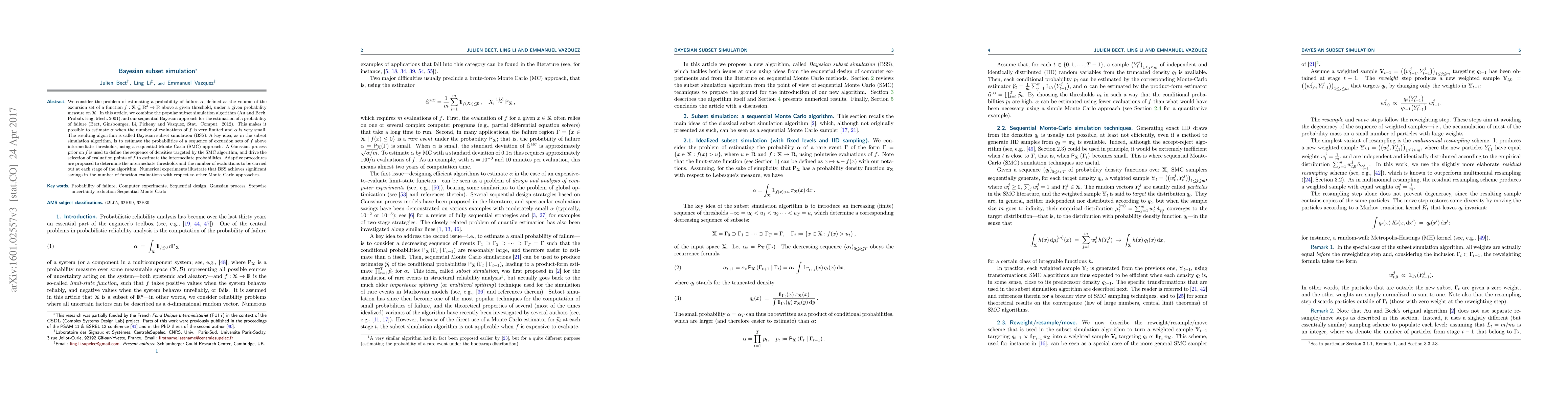 The Bayesian subset simulation algorithm combines a sequential Bayesian approach with the popular subset simulation method to estimate the probability of failure with limited function evaluations, achieving significant savings over other Monte Carlo approaches.