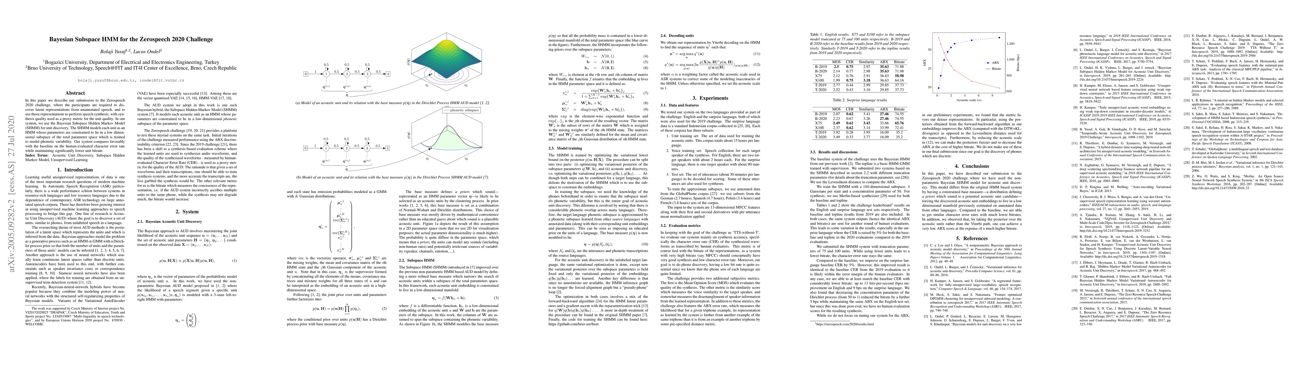 In this paper we describe our submission to the Zerospeech 2020 challenge, where the participants are required to discover latent representations from unannotated speech, and to use those representations to perform speech synthesis, with synthesis quality used as a proxy metric for the unit quality. In our system, we use the Bayesian Subspace Hidden Markov Model (SHMM) for unit discovery. The SHMM models each unit as an HMM whose parameters are constrained to lie in a low dimensional subspace of the total parameter space which is trained to model phonetic variability. Our system compares favorably with the baseline on the human-evaluated character error rate while maintaining significantly lower unit bitrate.