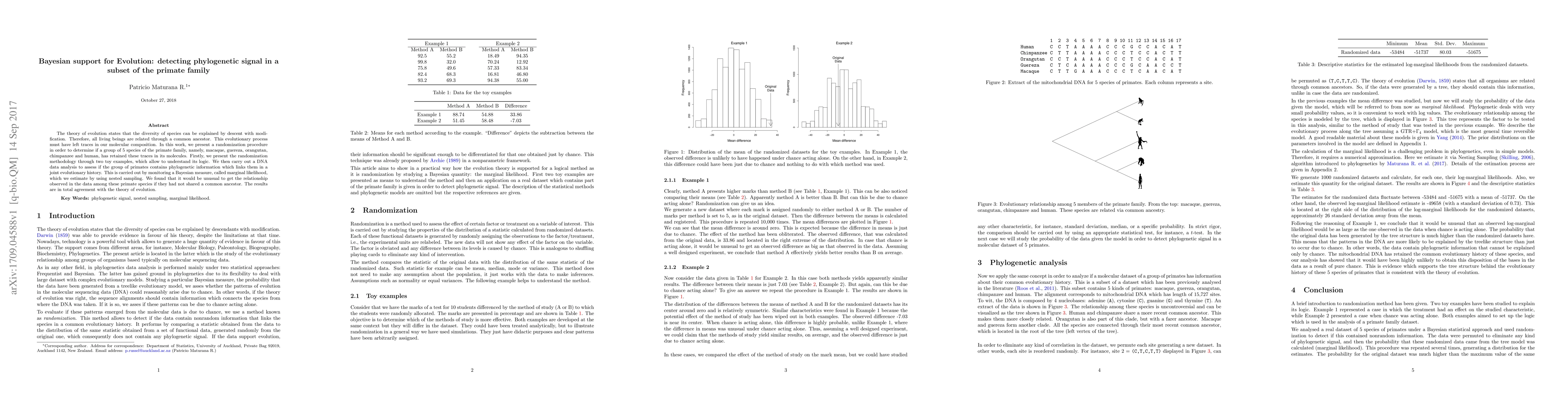 The theory of evolution states that the diversity of species can be explained by descent with modification. Therefore, all living beings are related through a common ancestor. This evolutionary process must have left traces in our molecular composition. In this work, we present a randomization procedure in order to determine if a group of 5 species of the primate family, namely, macaque, guereza, orangutan, chimpanzee and human, has retained these traces in its molecules. Firstly, we present the randomization methodology through two toy examples, which allow to understand its logic. We then carry out a DNA data analysis to assess if the group of primates contains phylogenetic information which links them in a joint evolutionary history. This is carried out by monitoring a Bayesian measure, called marginal likelihood, which we estimate by using nested sampling. We found that it would be unusual to get the relationship observed in the data among these primate species if they had not shared a common ancestor. The results are in total agreement with the theory of evolution.