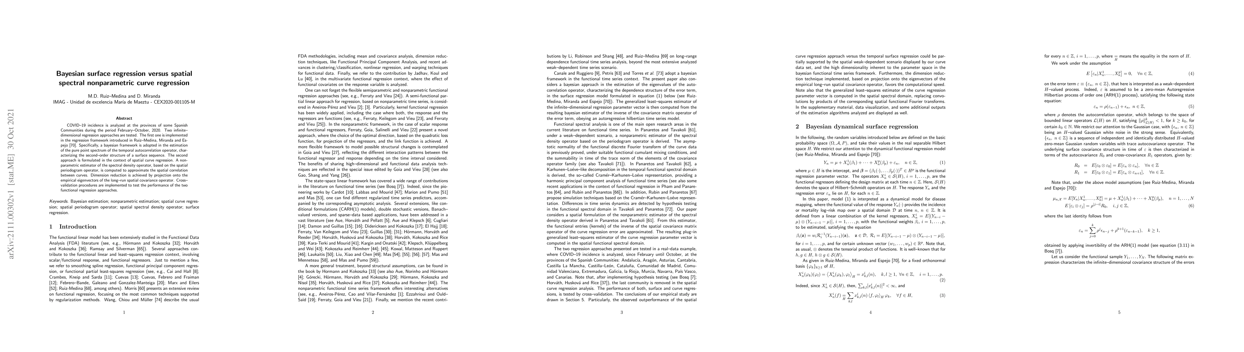 This paper compares Bayesian surface regression and spatial spectral nonparametric curve regression to analyze COVID-19 incidence in Spanish provinces from February to October 2020. The Bayesian approach estimates the temporal autocorrelation, while the spatial spectral method uses the spatial periodogram and empirical eigenvectors for dimension reduction. Cross-validation assesses the performance of both methods.