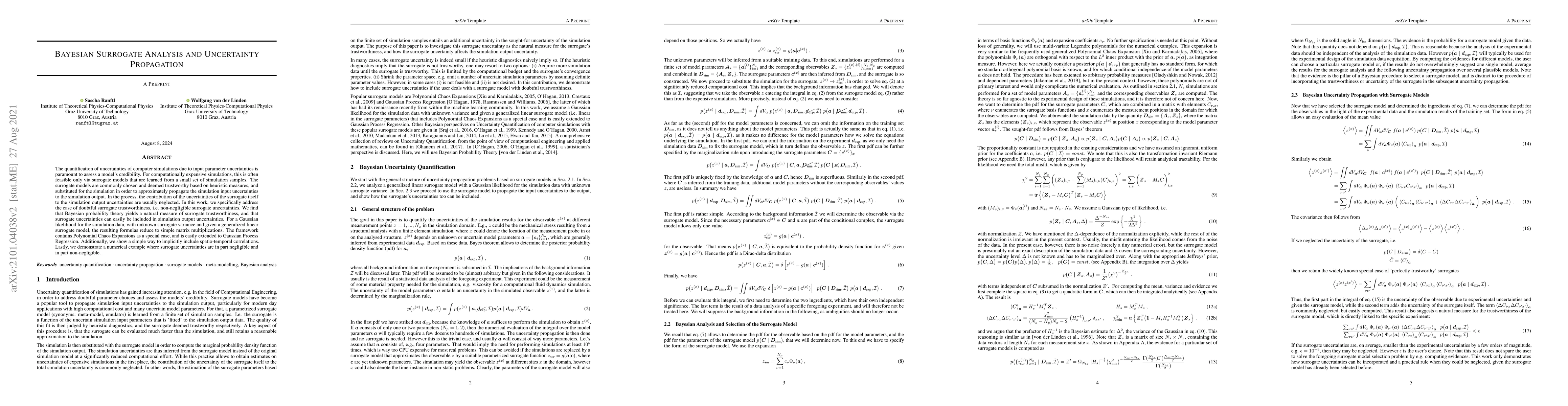 The quantification of uncertainties of computer simulations due to input parameter uncertainties is paramount to assess a model's credibility. For computationally expensive simulations, this is often feasible only via surrogate models that are learned from a small set of simulation samples. The surrogate models are commonly chosen and deemed trustworthy based on heuristic measures, and substituted for the simulation in order to approximately propagate the simulation input uncertainties to the simulation output. In the process, the contribution of the uncertainties of the surrogate itself to the simulation output uncertainties are usually neglected. In this work, we specifically address the case of doubtful surrogate trustworthiness, i.e. non-negligible surrogate uncertainties. We find that Bayesian probability theory yields a natural measure of surrogate trustworthiness, and that surrogate uncertainties can easily be included in simulation output uncertainties. For a Gaussian likelihood for the simulation data, with unknown surrogate variance and given a generalized linear surrogate model, the resulting formulas reduce to simple matrix multiplications. The framework contains Polynomial Chaos Expansions as a special case, and is easily extended to Gaussian Process Regression. Additionally, we show a simple way to implicitly include spatio-temporal correlations. Lastly, we demonstrate a numerical example where surrogate uncertainties are in part negligible and in part non-negligible.