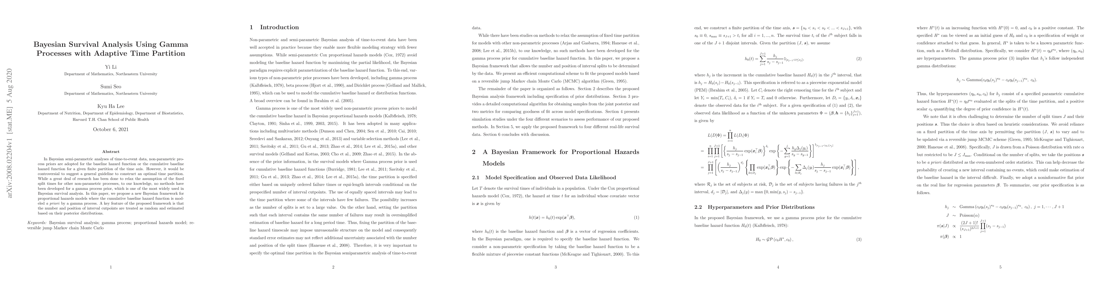 This paper introduces a novel Bayesian framework for survival analysis using gamma processes with adaptive time partition. The proposed method allows the number and position of interval cutpoints to be random and estimated, enhancing flexibility over traditional fixed partitions.