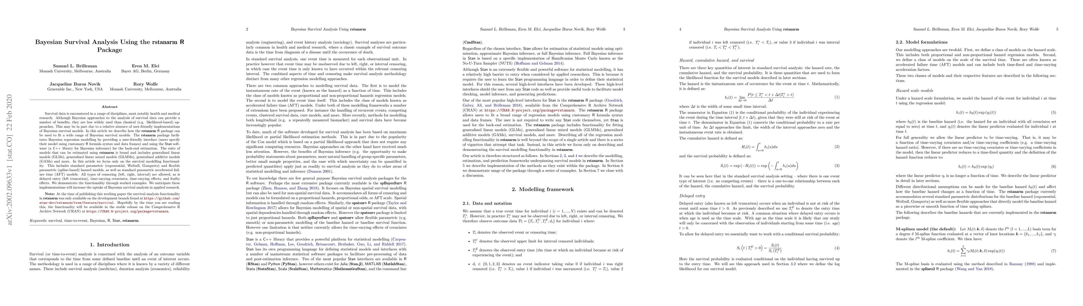 This paper explores the use of the rstanarm R package for Bayesian survival analysis, highlighting its user-friendly interface and broad model capabilities, including parametric and flexible hazard models, accelerated failure time models, and various types of censoring. The authors demonstrate its functionality through practical examples, aiming to boost the adoption of Bayesian methods in survival data analysis.