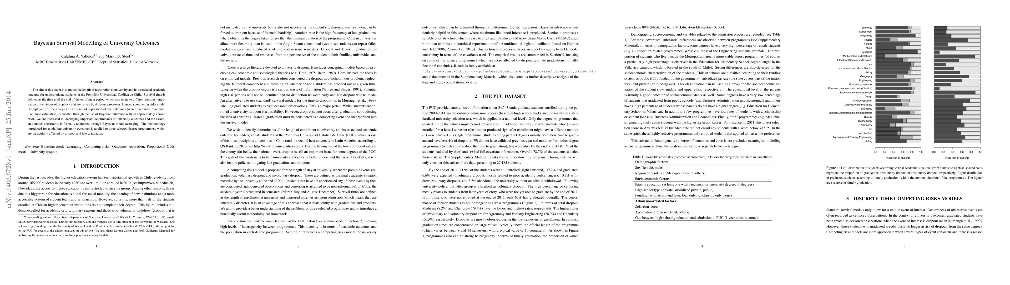 The aim of this paper is to model the length of registration at university and its associated academic outcome for undergraduate students at the Pontificia Universidad Cat\'olica de Chile. Survival time is defined as the time until the end of the enrollment period, which can relate to different reasons - graduation or two types of dropout - that are driven by different processes. Hence, a competing risks model is employed for the analysis. The issue of separation of the outcomes (which precludes maximum likelihood estimation) is handled through the use of Bayesian inference with an appropriately chosen prior. We are interested in identifying important determinants of university outcomes and the associ- ated model uncertainty is formally addressed through Bayesian model averaging. The methodology introduced for modelling university outcomes is applied to three selected degree programmes, which are particularly affected by dropout and late graduation.