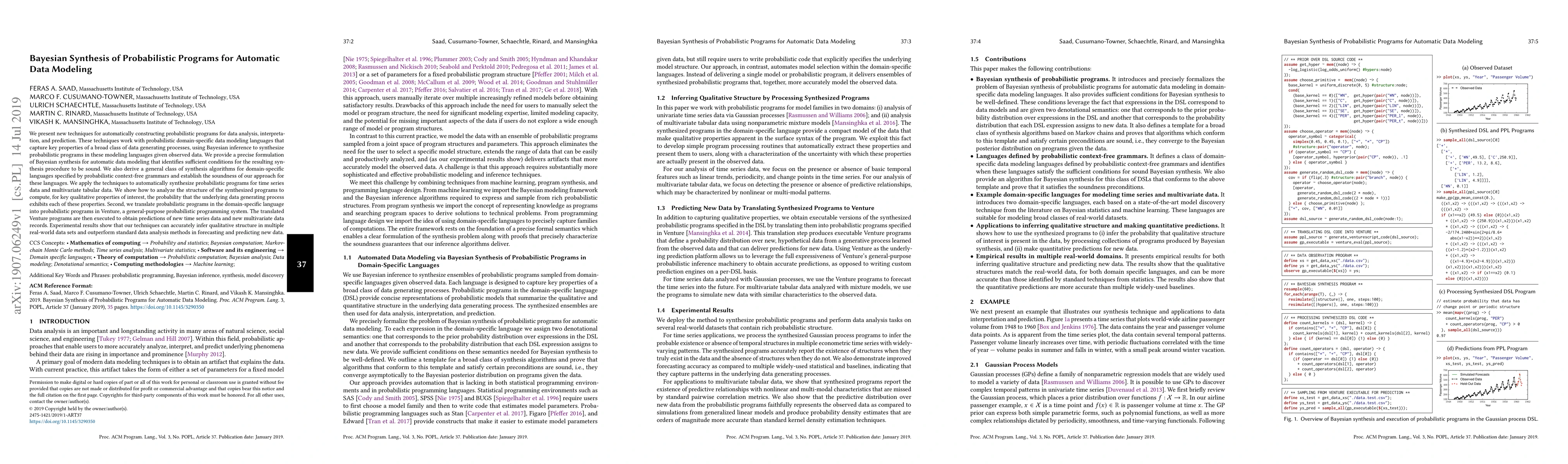 This paper introduces Bayesian synthesis techniques for automatically constructing probabilistic programs to model and predict data. The authors develop a framework that translates observed data into probabilistic programs using Bayesian inference, demonstrating soundness and effectiveness through applications to time series and multivariate data, outperforming standard methods.