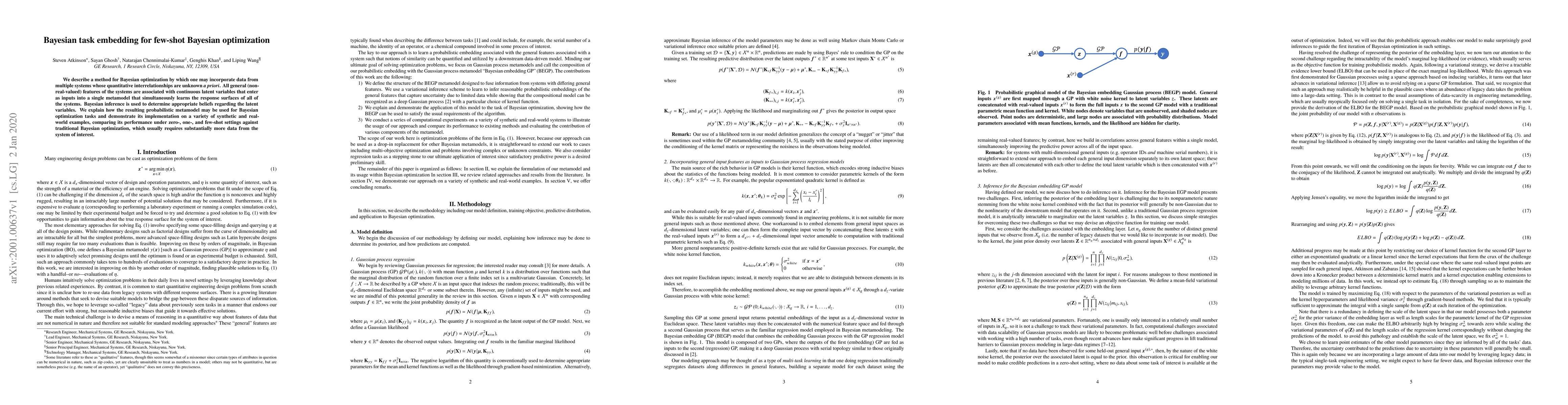 We describe a method for Bayesian optimization by which one may incorporate data from multiple systems whose quantitative interrelationships are unknown a priori. All general (nonreal-valued) features of the systems are associated with continuous latent variables that enter as inputs into a single metamodel that simultaneously learns the response surfaces of all of the systems. Bayesian inference is used to determine appropriate beliefs regarding the latent variables. We explain how the resulting probabilistic metamodel may be used for Bayesian optimization tasks and demonstrate its implementation on a variety of synthetic and real-world examples, comparing its performance under zero-, one-, and few-shot settings against traditional Bayesian optimization, which usually requires substantially more data from the system of interest.