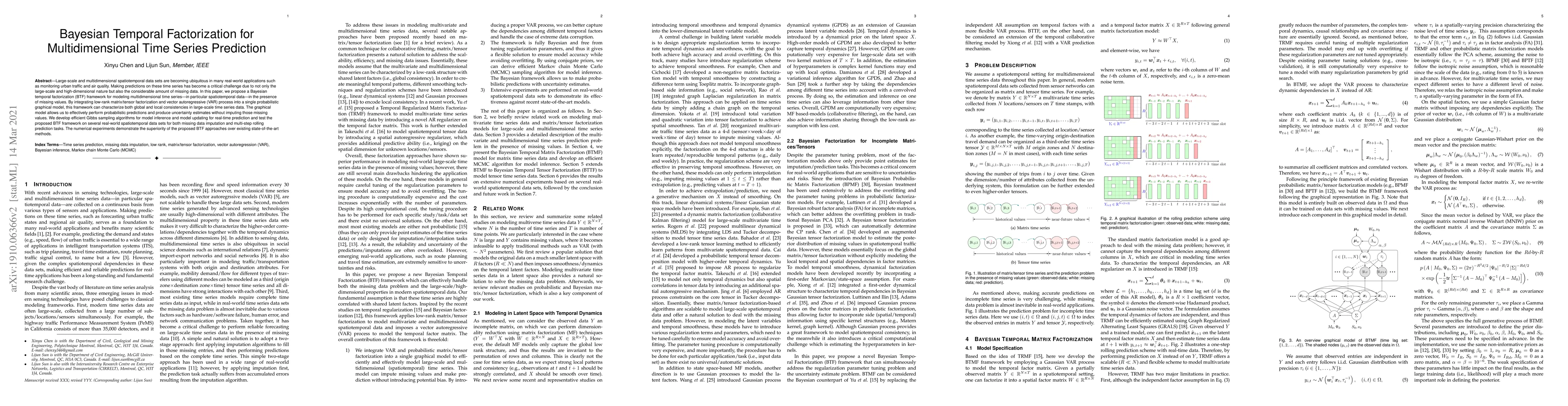 This paper introduces a Bayesian Temporal Factorization (BTF) framework for predicting multidimensional spatiotemporal time series, especially in the presence of missing data. The proposed model integrates low-rank factorization and vector autoregressive processes to capture both global and local consistencies in large-scale data, enabling probabilistic predictions and uncertainty estimates without imputing missing values.