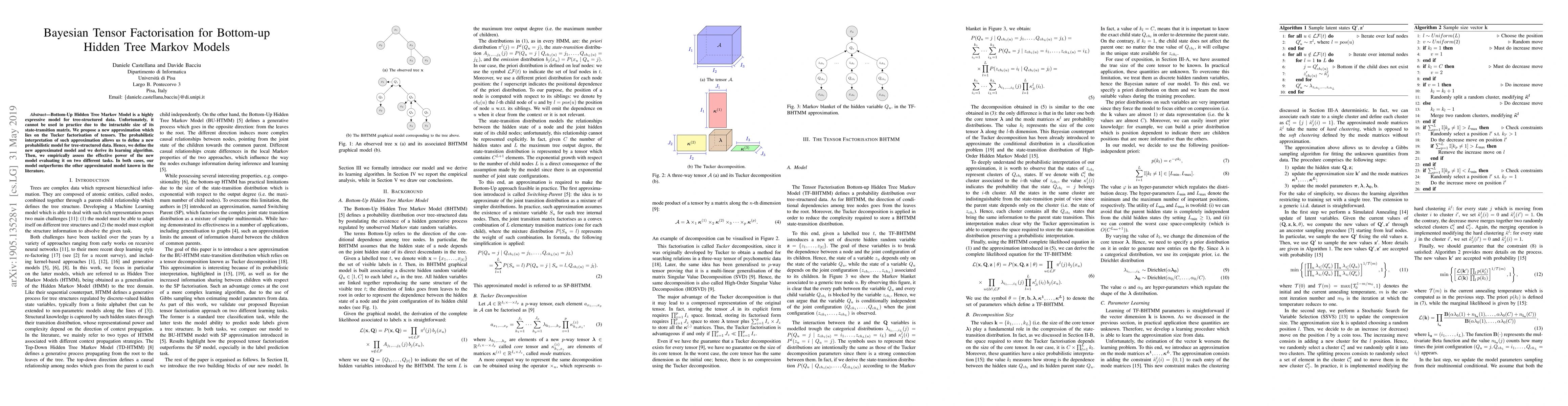 This paper proposes a Bayesian tensor factorization approach for Bottom-Up Hidden Tree Markov Models to address the intractable size of state-transition matrices. The new probabilistic model, derived from Tucker factorization, outperforms existing models in empirical evaluations on two tasks.