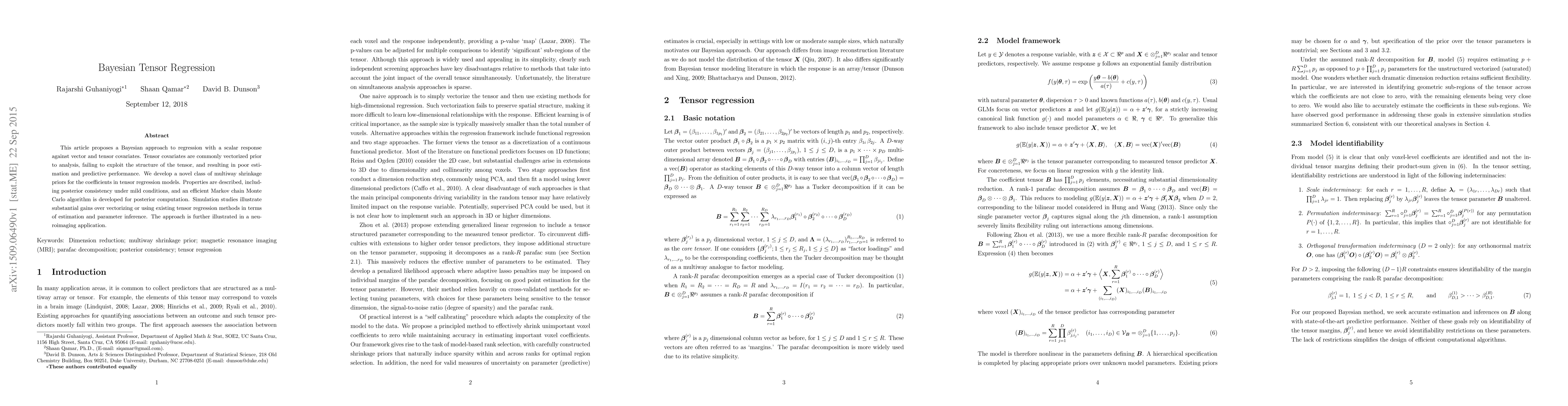 This article proposes a Bayesian approach to regression with a scalar response against vector and tensor covariates. Tensor covariates are commonly vectorized prior to analysis, failing to exploit the structure of the tensor, and resulting in poor estimation and predictive performance. We develop a novel class of multiway shrinkage priors for the coefficients in tensor regression models. Properties are described, including posterior consistency under mild conditions, and an efficient Markov chain Monte Carlo algorithm is developed for posterior computation. Simulation studies illustrate substantial gains over vectorizing or using existing tensor regression methods in terms of estimation and parameter inference. The approach is further illustrated in a neuroimaging application. Keywords: Dimension reduction; multiway shrinkage prior; magnetic resonance imaging (MRI); parafac decomposition; posterior consistency; tensor regression