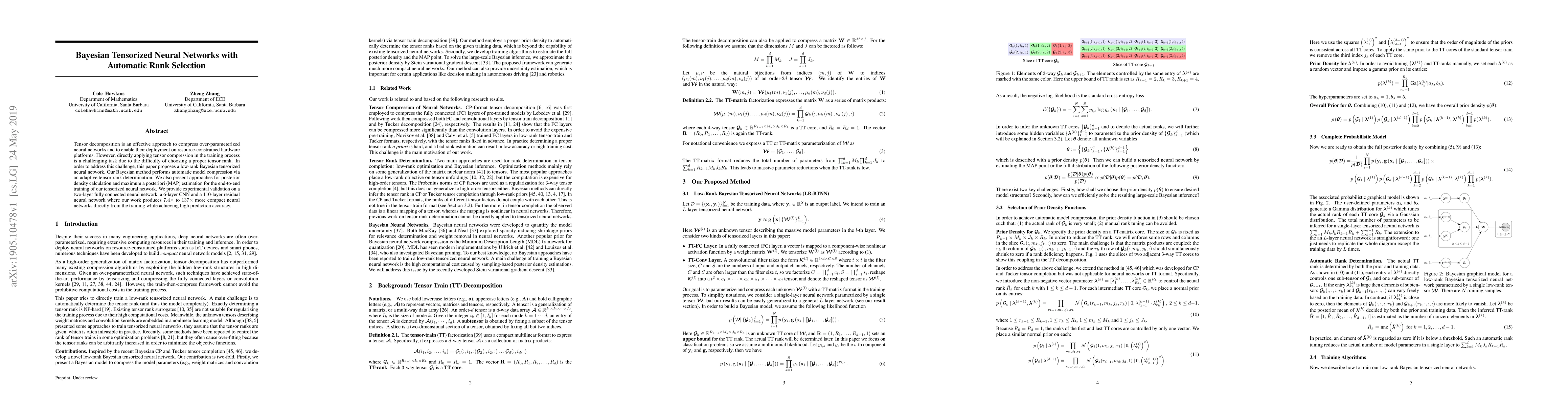 This paper introduces a Bayesian tensorized neural network that automatically selects the optimal tensor rank during training, enabling efficient model compression and deployment on resource-constrained hardware. Experimental results show significant reductions in model size across various neural network architectures.