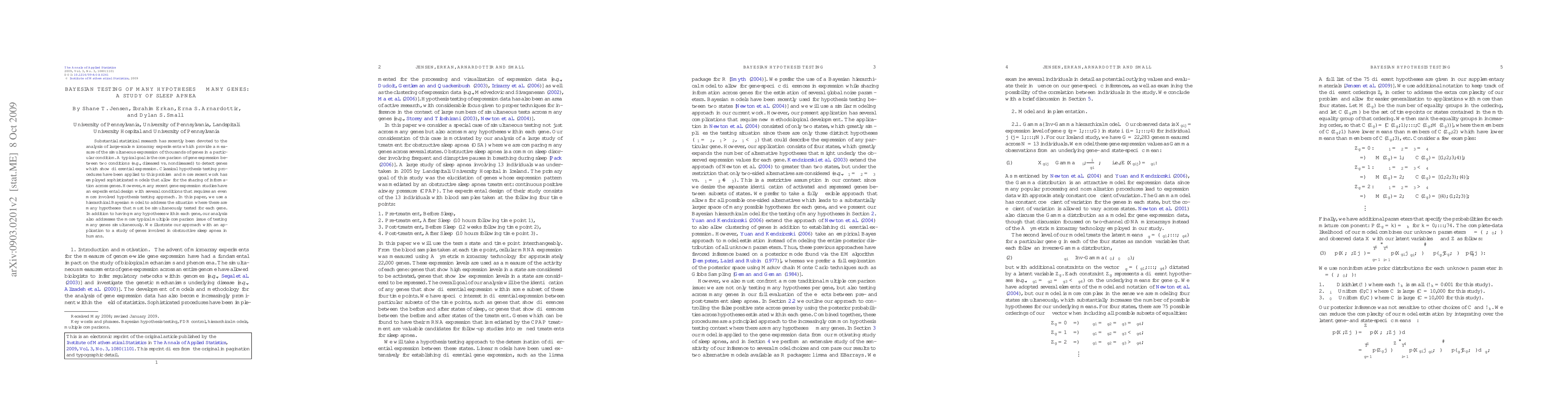 This paper proposes a hierarchical Bayesian model to simultaneously test many hypotheses for each gene while addressing the multiple comparison issue inherent in large-scale gene expression studies. The method is applied to identify genes involved in obstructive sleep apnea, demonstrating its utility in complex experimental designs.