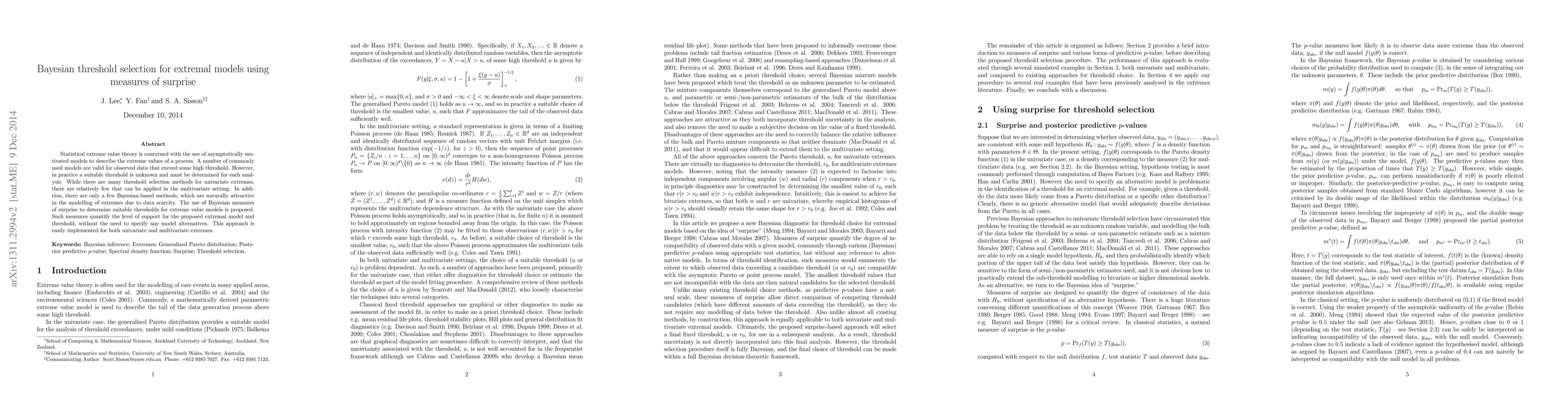 Statistical extreme value theory is concerned with the use of asymptotically motivated models to describe the extreme values of a process. A number of commonly used models are valid for observed data that exceed some high threshold. However, in practice a suitable threshold is unknown and must be determined for each analysis. While there are many threshold selection methods for univariate extremes, there are relatively few that can be applied in the multivariate setting. In addition, there are only a few Bayesian-based methods, which are naturally attractive in the modelling of extremes due to data scarcity. The use of Bayesian measures of surprise to determine suitable thresholds for extreme value models is proposed. Such measures quantify the level of support for the proposed extremal model and threshold, without the need to specify any model alternatives. This approach is easily implemented for both univariate and multivariate extremes.