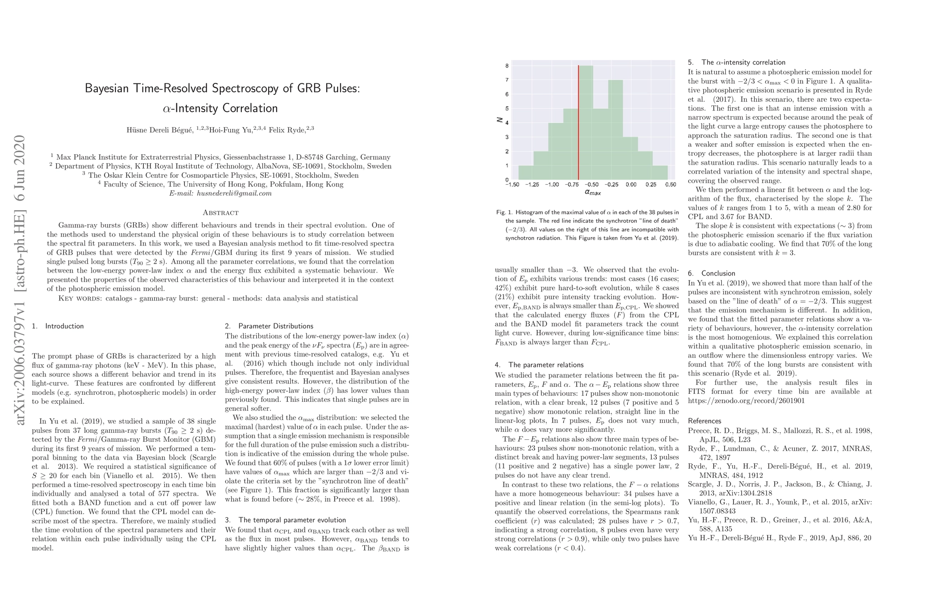 Gamma-ray bursts (GRBs) show different behaviours and trends in their spectral evolution. One of the methods used to understand the physical origin of these behaviours is to study correlation between the spectral fit parameters. In this work, we used a Bayesian analysis method to fit time-resolved spectra of GRB pulses that were detected by the \textit{Fermi}/GBM during its first 9 years of mission. We studied single pulsed long bursts ($T_{90}\geq2$ s). Among all the parameter correlations, we found that the correlation between the low-energy power-law index $\alpha$ and the energy flux exhibited a systematic behaviour. We presented the properties of the observed characteristics of this behaviour and interpreted it in the context of the photospheric emission model.