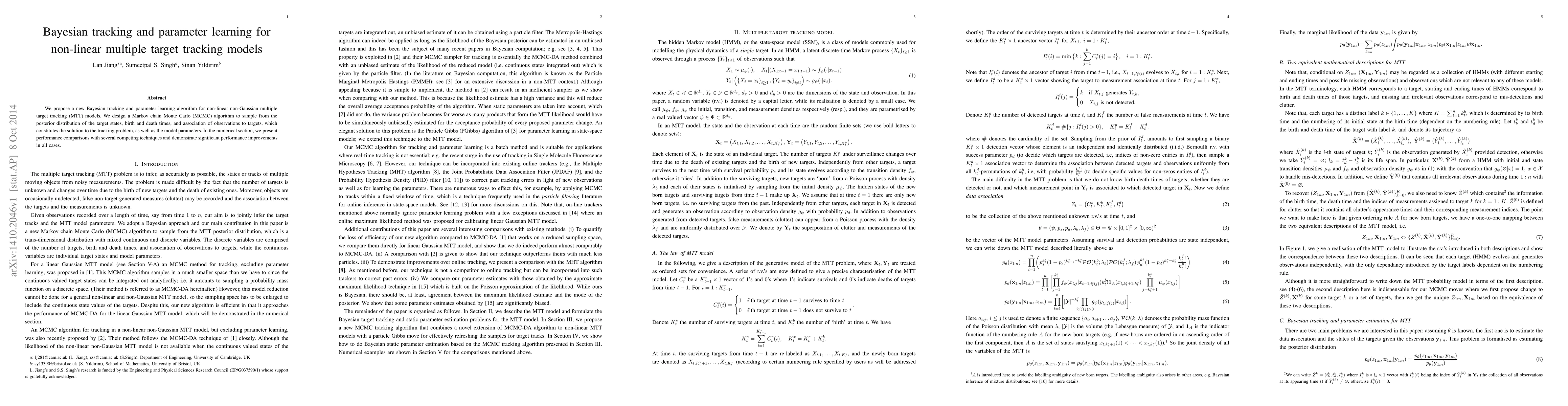 This paper introduces a novel Bayesian tracking and parameter learning algorithm for non-linear non-Gaussian multiple target tracking models, utilizing a Markov chain Monte Carlo (MCMC) approach to sample the posterior distribution. The method shows significant performance improvements over competing techniques in numerical comparisons.