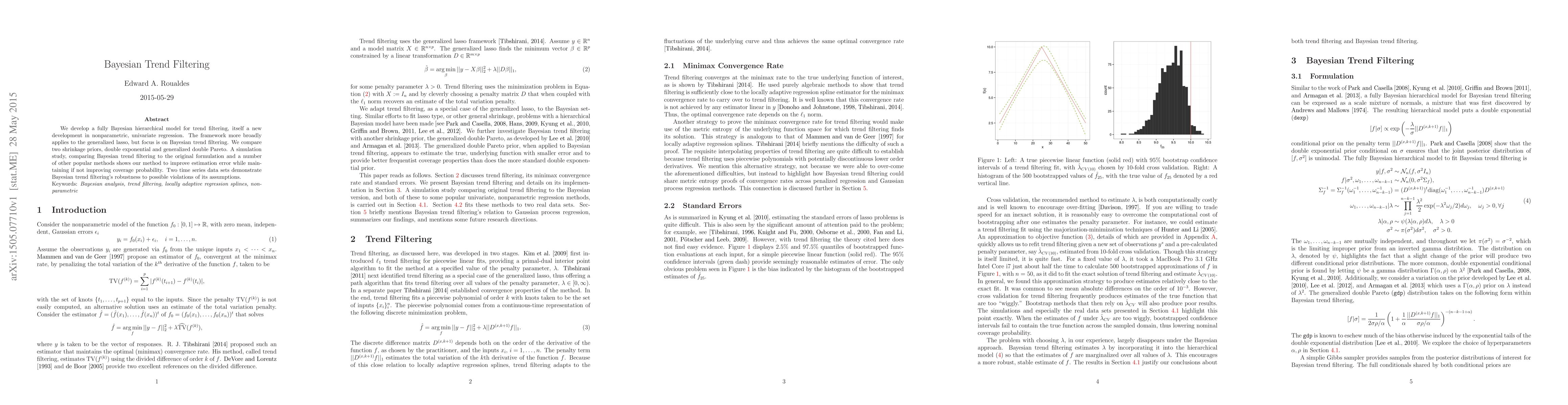 This paper introduces a Bayesian hierarchical model for trend filtering in nonparametric regression, comparing double exponential and generalized double Pareto shrinkage priors. Simulation results show improved estimation accuracy and robust coverage probability, validated by two time series datasets.