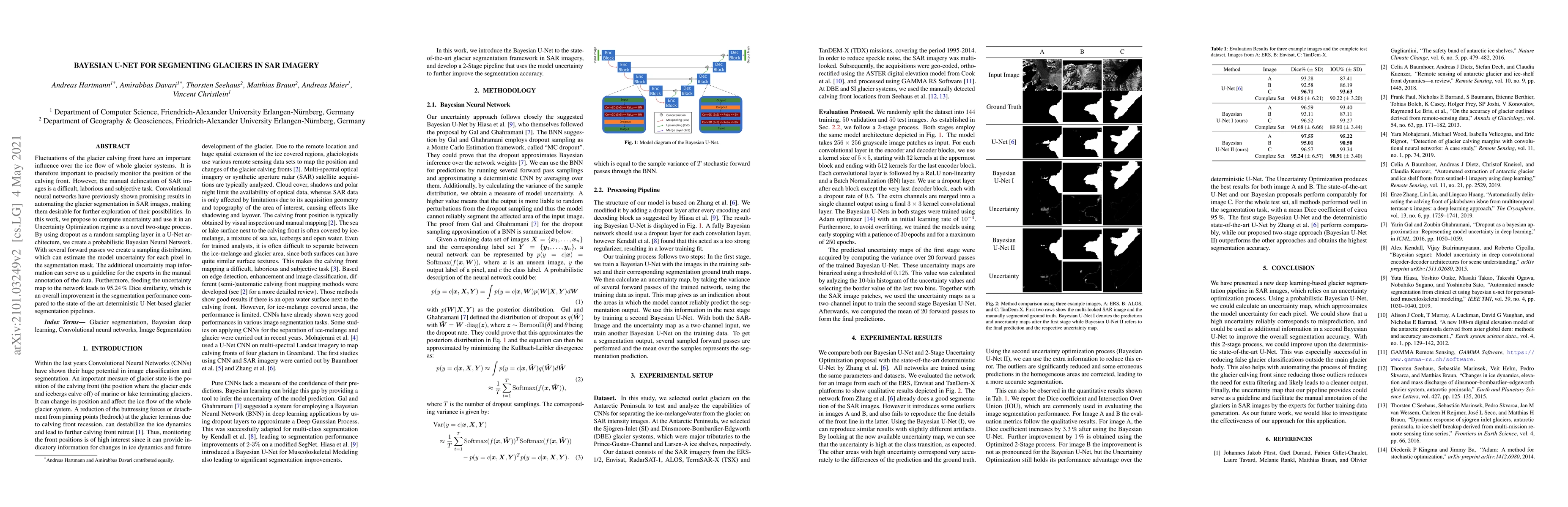 This paper proposes a Bayesian U-Net for glacier segmentation in SAR imagery, utilizing dropout to create a probabilistic model that estimates uncertainty. The method achieves 95.24% Dice similarity, outperforming deterministic U-Nets, and provides uncertainty maps that assist in manual annotation.
