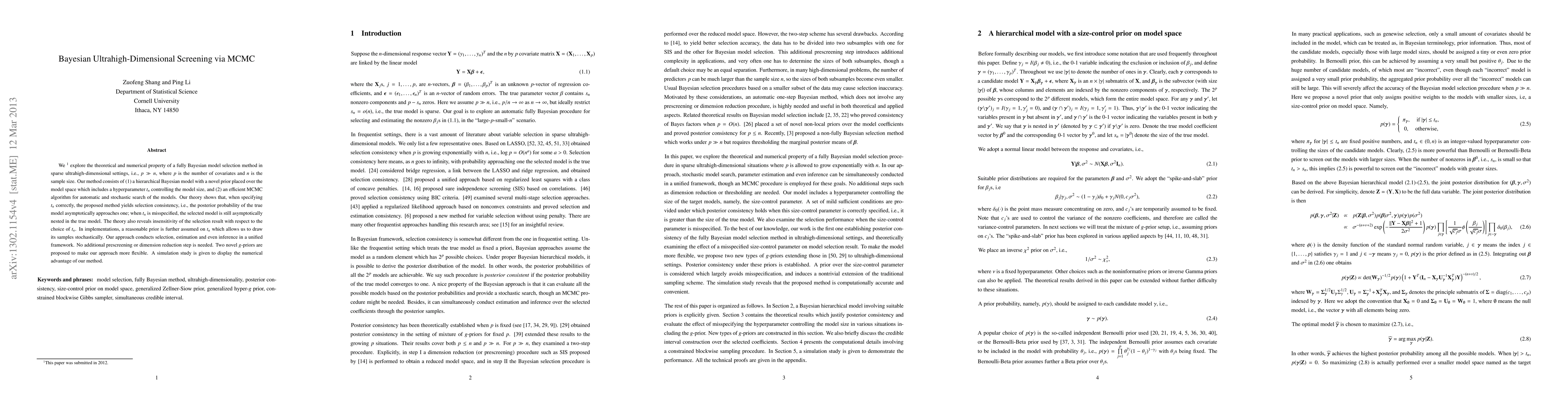 A Bayesian method for selecting models in high-dimensional settings is proposed, which combines hierarchical modeling with Markov Chain Monte Carlo (MCMC) algorithm to achieve model selection consistency and flexibility.