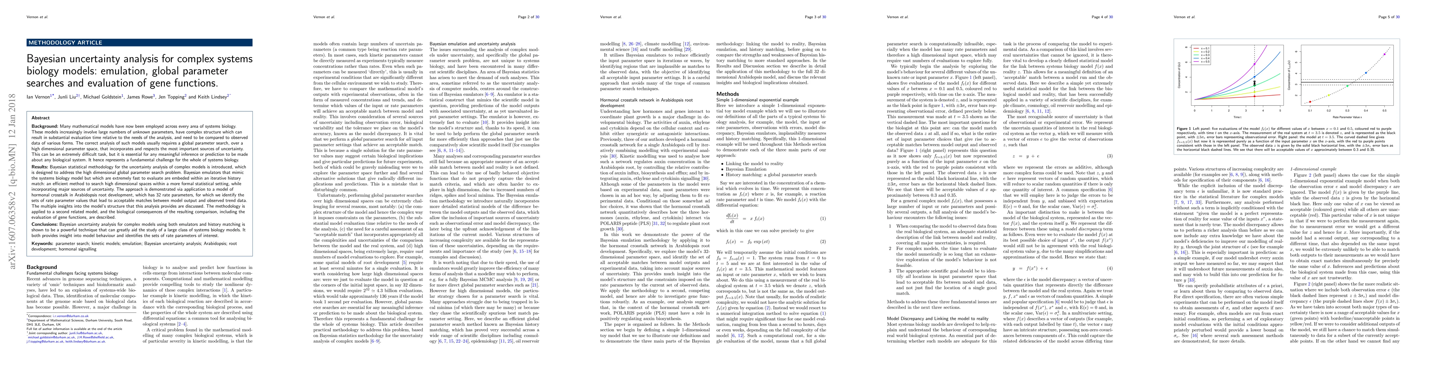 This paper introduces Bayesian statistical methods for uncertainty analysis in complex systems biology models, employing fast emulators within an iterative history matching approach to efficiently search high-dimensional parameter spaces. The method is demonstrated on hormonal crosstalk models in Arabidopsis root development, identifying parameter sets that match observed data and evaluating gene functions.