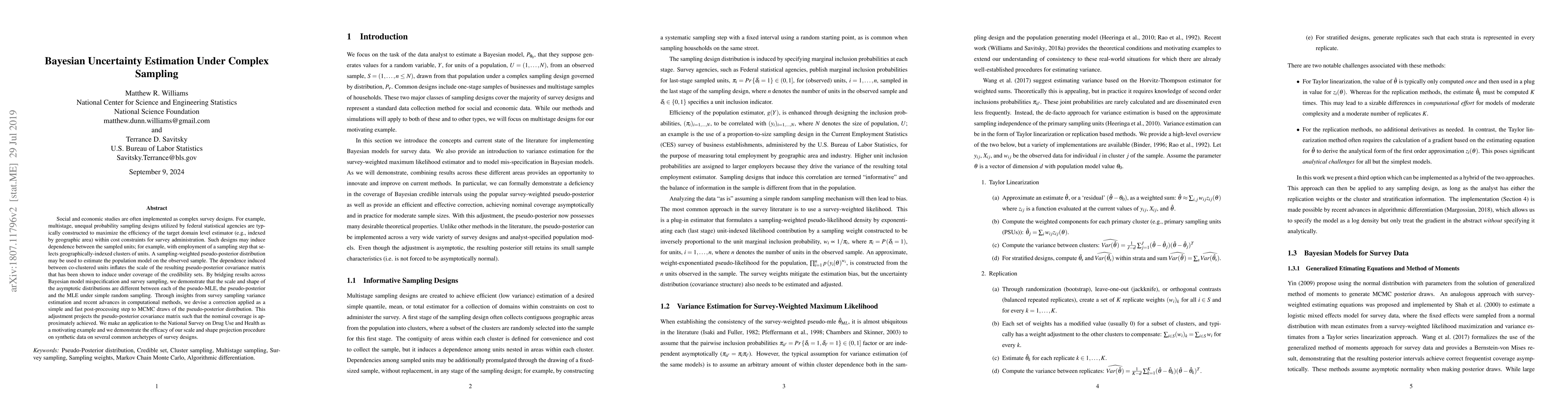 This paper addresses Bayesian uncertainty estimation in complex survey designs, showing that pseudo-posterior distributions can under-cover due to induced dependence between clusters. It proposes a correction method to adjust the pseudo-posterior covariance matrix for achieving nominal coverage, demonstrated through applications to the National Survey on Drug Use and Health and synthetic data.